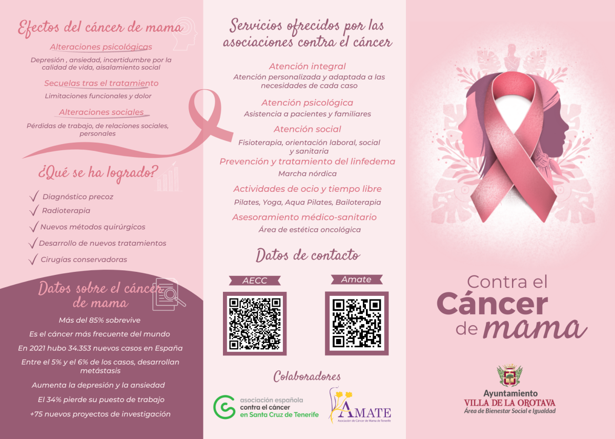 Para el día 19 de octubre, con motivo del Día Mundial contra el Cáncer de mama, el Área de Bienestar Social e Igualdad, en colaboración con los componentes del Área de Animación Socio-cultural, han elaborado un tríptico informativo relativo a esta enfermedad con el objetivo de concienciar a la ciudadanía. Para ello se ha solicitado información a la Asociación ÁMATE, así como a la Asociación Española Contra el Cáncer (AECC).