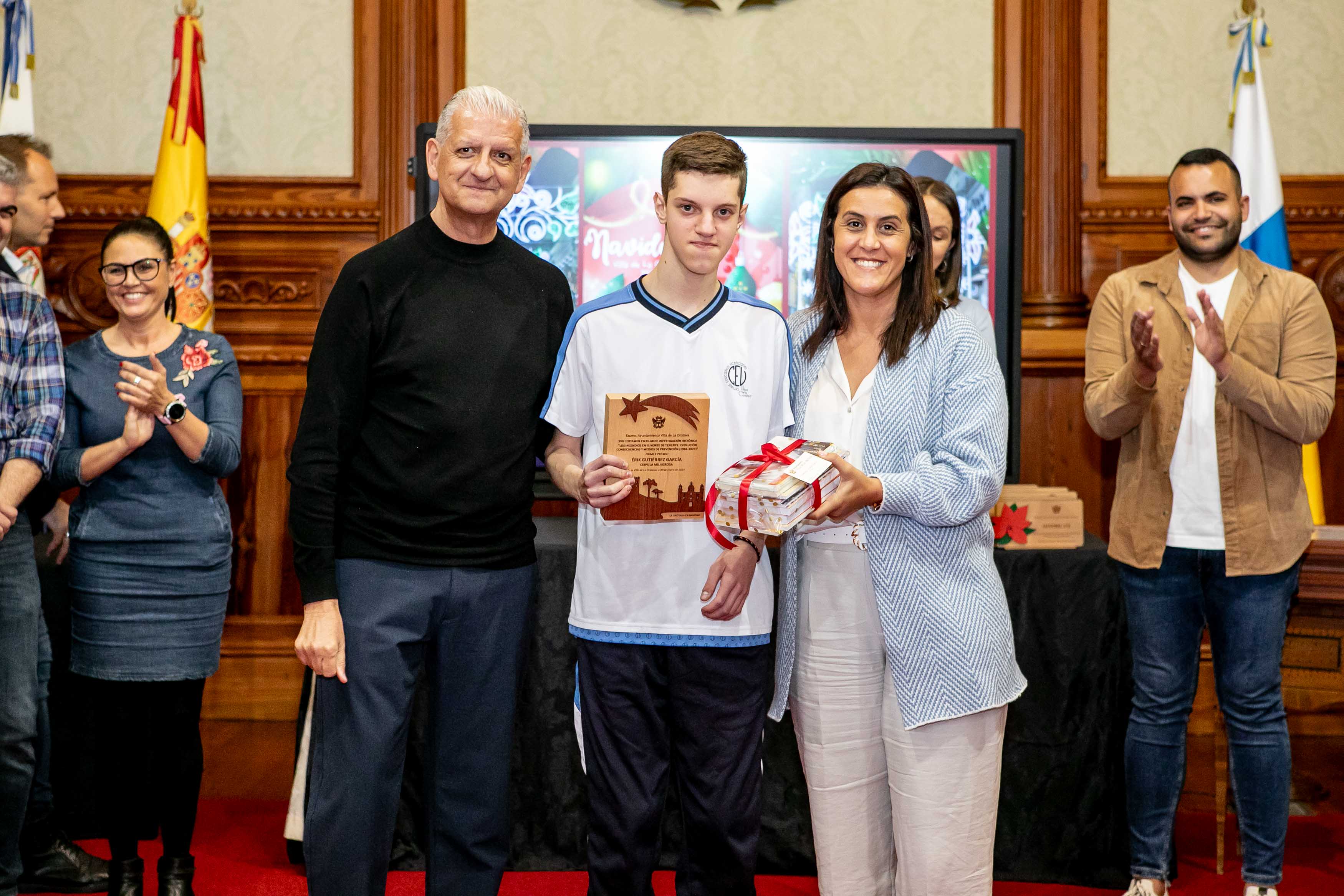 En el certamen de Investigación Histórica, que este año versaba sobre el incendio que sufrió Tenerife el pasado mes de agosto, el primer premio fue para el equipo de Laura Jiménez García, Álvaro Iariza Pérez, Erik Gutiérrez García y Xiomara Carballo Santos, mientras que el segundo fue par Alba Luis González y Laura Cabrera Carballo. El equipo de Valeria Sánchez Martín, Inés Dévora Chinea, Diego Padrón González y Javier Álvarez Hernández, recibió accésit.