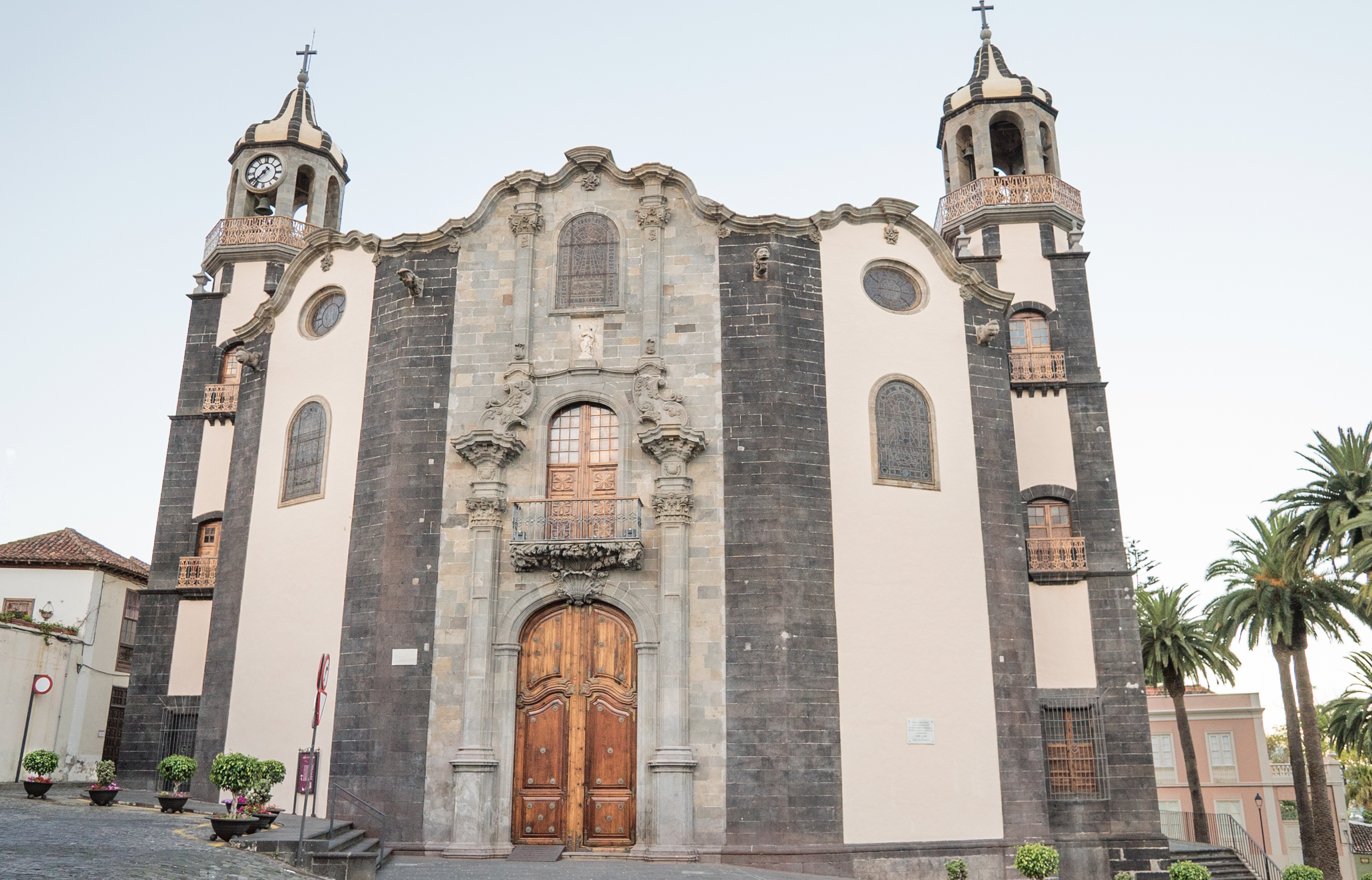 La fachada es una de las portadas barrocas más interesantes de cuantas existen en Canarias. Detengámonos un momento a contemplar el exterior de esta iglesia. Fíjate en la fachada curva que divide las tres naves del templo y la elegante portada en piedra. Las torres del campanario y el reloj se elevan en segundo término. Este conjunto de fachada y torres marca la verticalidad del templo, proyectando en nosotros la sensación de rotundidad y elevación. A esta verticalidad se le suma la sensación de movimiento con la cornisa serpenteante y la curva que forma las tres naves. Otro elemento más acentúa la sensación de movimiento, inquietud y desasosiego: las impresionantes gárgolas influenciadas por los bestiarios medievales y la escultura aborigen americana.