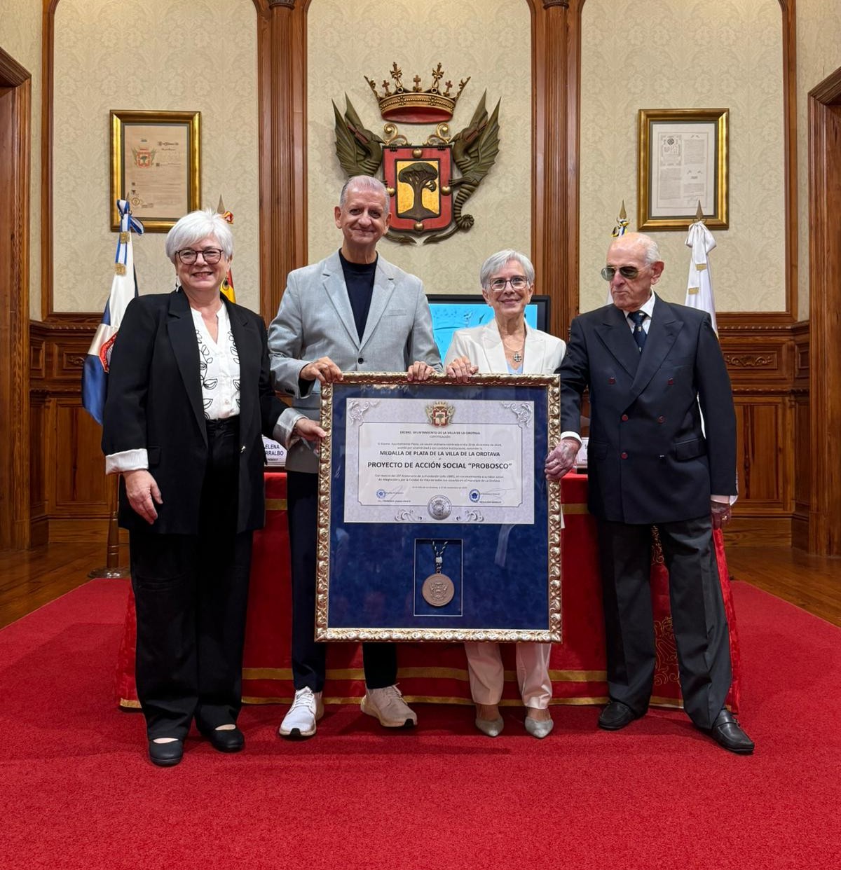 El Ayuntamiento de La Orotava concede la Medalla de Plata del municipio a Probosco, en reconocimiento a sus años de labor, dedicación y compromiso con las personas con discapacidad intelectual y sus familias, así como por su contribución social, profesional y comunitaria al municipio. El acto de entrega tuvo lugar este jueves [27 de noviembre] en el Salón Noble del consistorio villero presidido por el alcalde Francisco Linares; el presidente honorífico de Probosco, Fernando Zárate Gómez-Landero; la presidenta Elena Zárate Martín y la directora de la entidad, Elena Cañete Torralbo.
