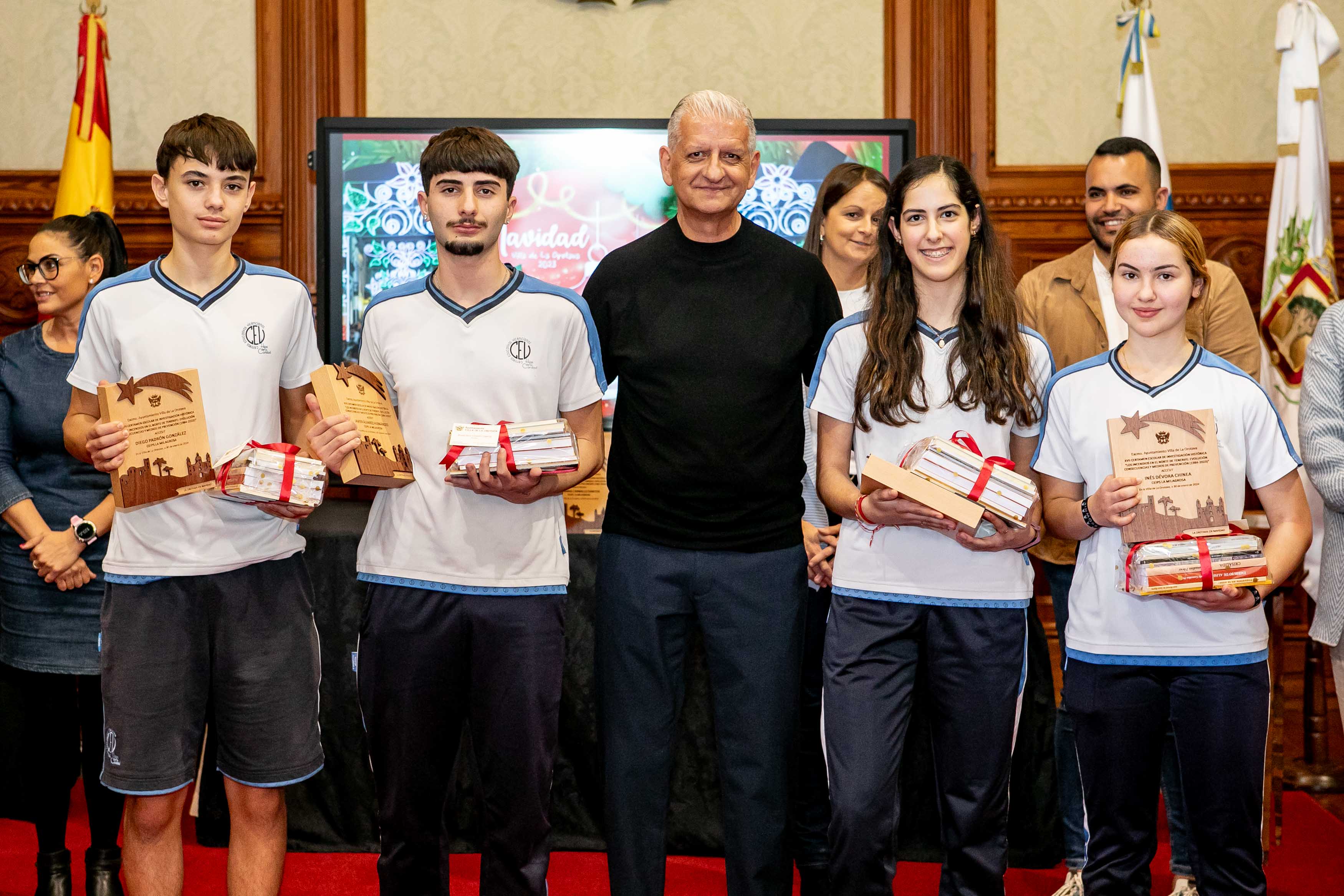 El Salón de Plenos acogió este martes [30 de enero] el acto de entrega de los premios de los concursos de Navidad, convocados cada año por las áreas de Cultura y Comercio del Ayuntamiento de La Orotava. Los certámenes del tarjetas, belenes y cuentos de navidad se convocan hace más de dos décadas; mientras que desde hace diecisiete se convoca el certamen de investigación. Y en los últimos años se ha sumado el concurso de remozar los escaparates y fachadas en las fechas navideñas.