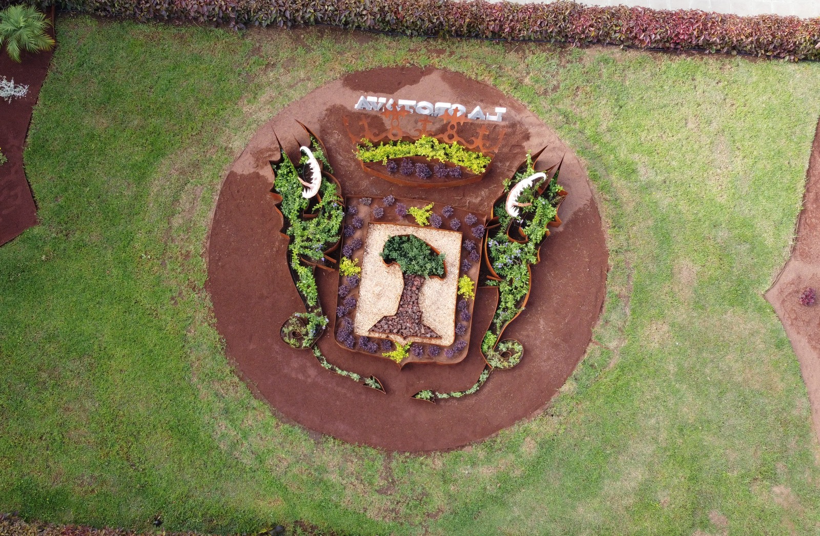 El escudo oficial del municipio, que fue concedido por S.M. El Rey Alfonso XIII el 15 de febrero de 1905, tiene un diámetro de ocho metros, aproximadamente, y se ha realizado con diversas plantas como el mirto, las durantas y el ficus pumila, junto con las flores de lis en forma de topiaria. Esta combinación crea un impacto visual impresionante y distintivo que refleja la identidad y el carácter único del municipio. El mirto, con su follaje verde oscuro y sus pequeñas flores blancas o rosadas, aportan un aspecto tradicional y mediterráneo al escudo, simbolizando la conexión con la naturaleza local. Las durantas agregan vitalidad y dinamismo al diseño, mientras que el ficus pumila proporciona una cobertura densa y verde que enmarcará el escudo de manera majestuosa. También se incluyeron las especies alternanthera y westringia. Las flores de lis, en forma de topiaria son el elemento distintivo del escudo, simbolizando la nobleza, la pureza y la elegancia. Su forma estilizada y su belleza atemporal resaltan la importancia y el orgullo del municipio. La bordura es de acero corten.