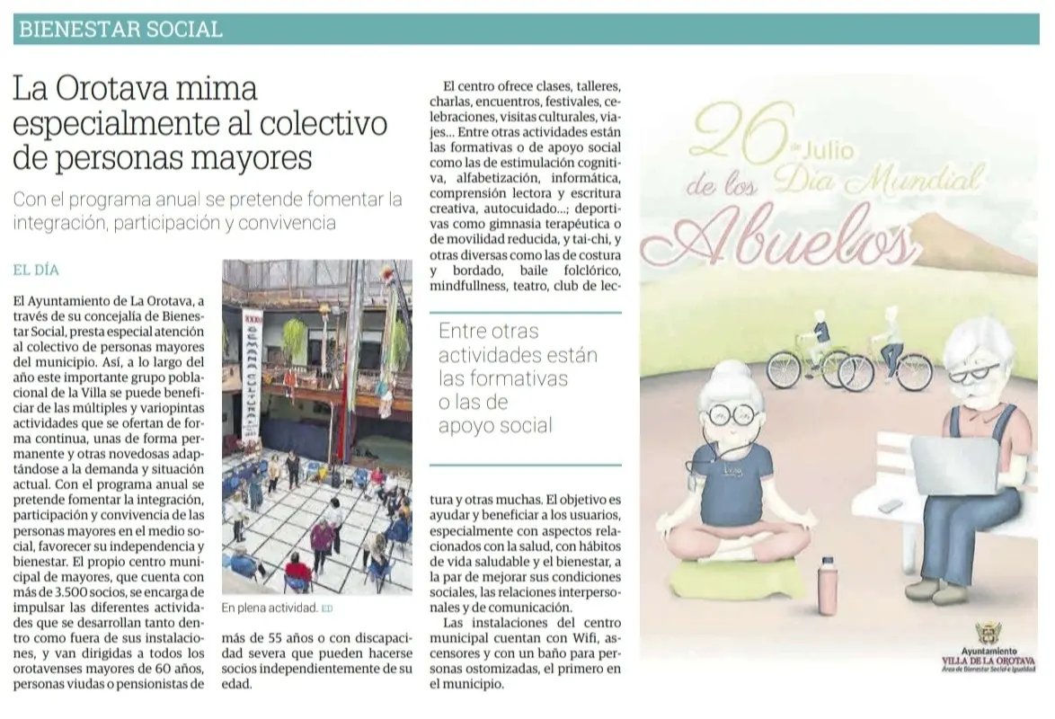 El Ayuntamiento de La Orotava, a través de su concejalía de Bienestar Social, presta especial atención al colectivo de personas mayores del municipio. Así, a lo largo del año este importante grupo poblacional de la Villa se puede beneficiar de las múltiples y variopintas actividades que se ofertan de forma continua, unas de forma permanente y otras novedosas adaptándose a la demanda y situación actual. Con el programa anual se pretende fomentar la integración, participación y convivencia de las personas mayores en el medio social, favorecer su independencia y bienestar. El propio centro municipal de mayores, que cuenta con más de 3.500 socios, se encarga de impulsar las diferentes actividades que se desarrollan tanto dentro como fuera de sus instalaciones, y van dirigidas a todos los orotavenses mayores de 60 años, personas viudas o pensionistas de más de 55 años o con discapacidad severa que pueden hacerse socios independientemente de su edad.