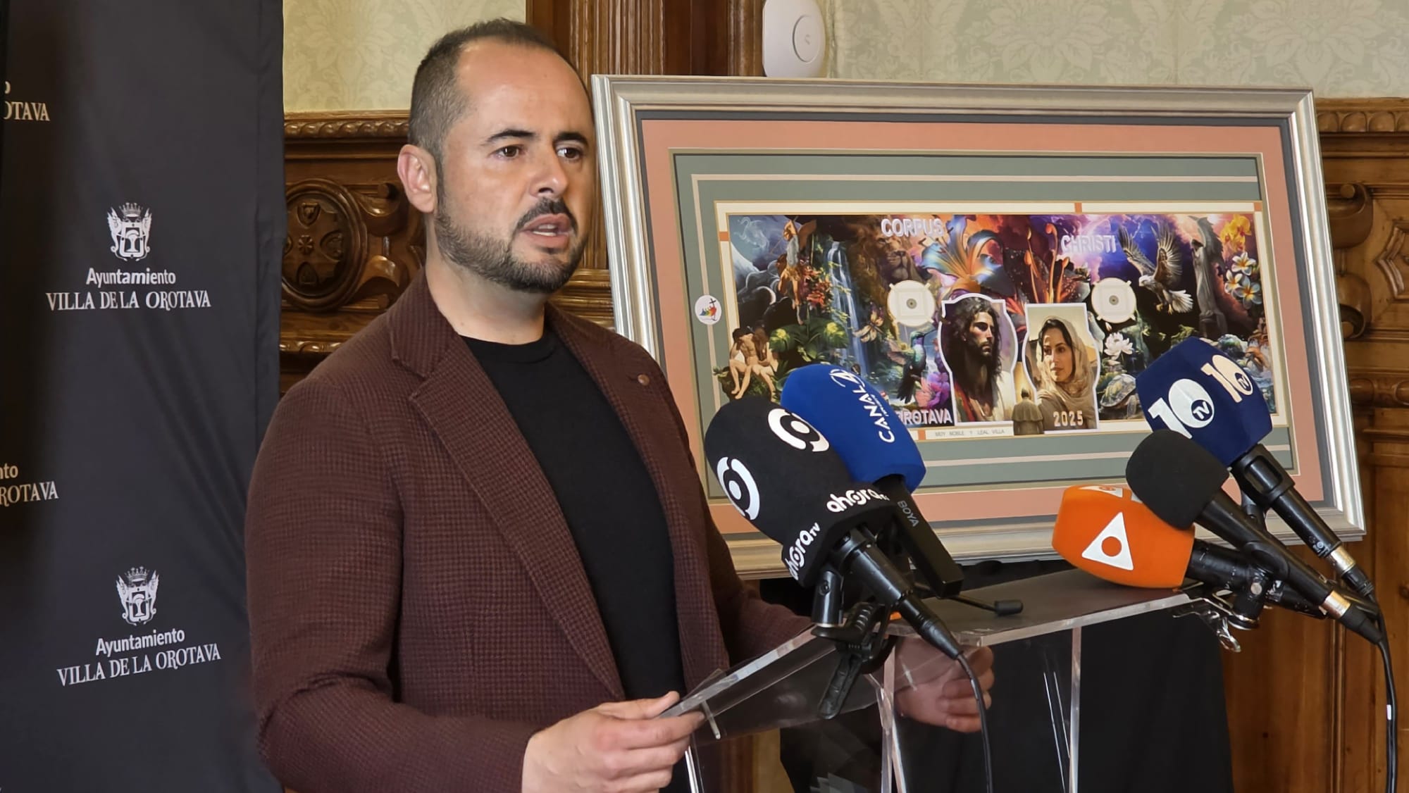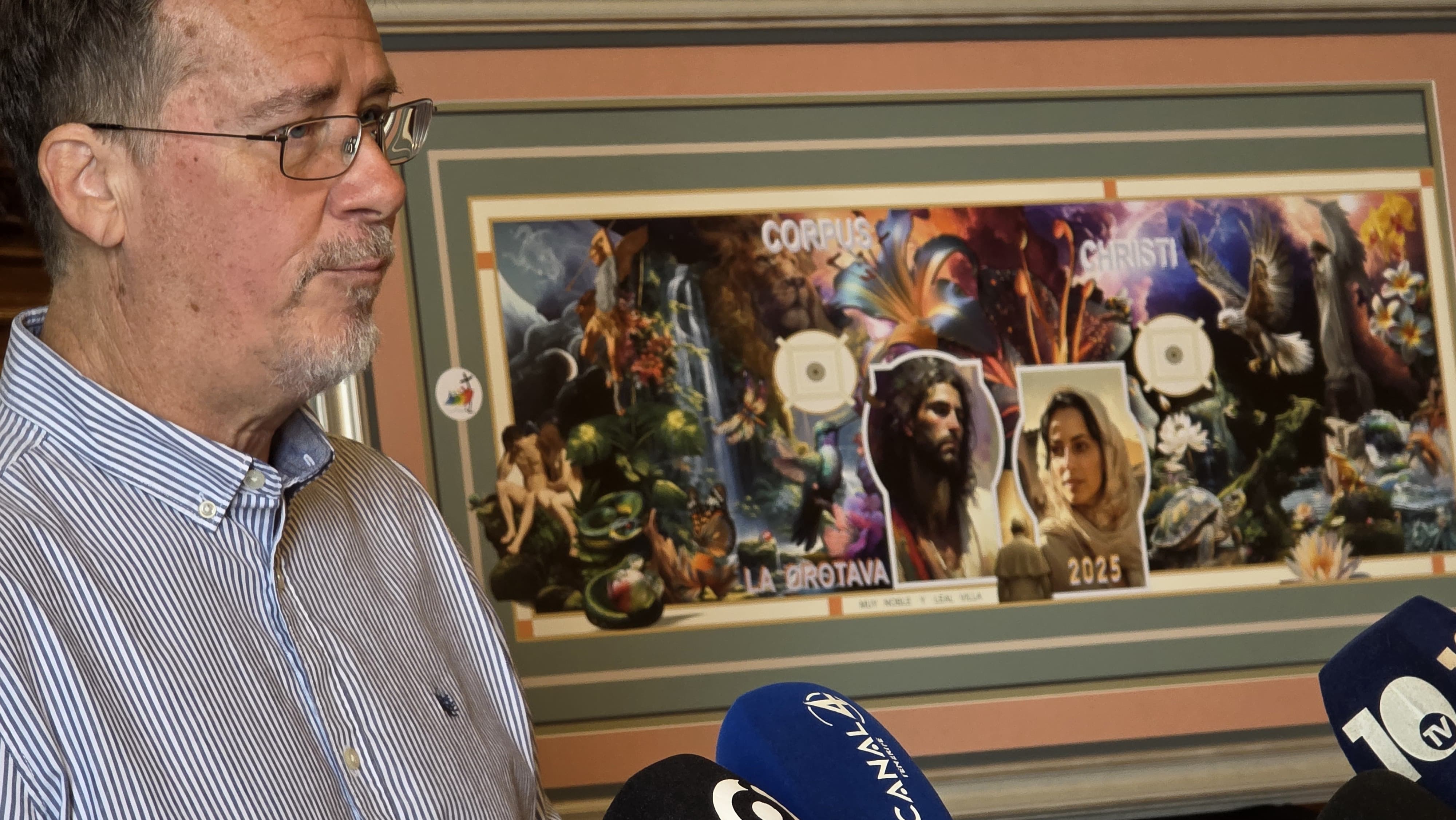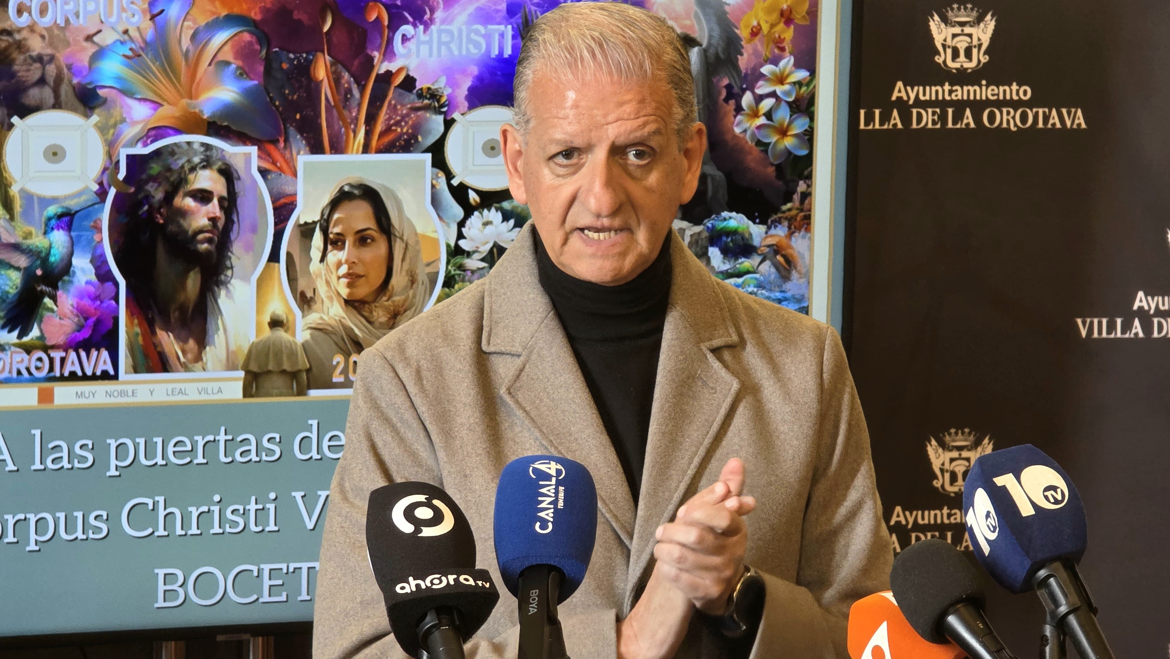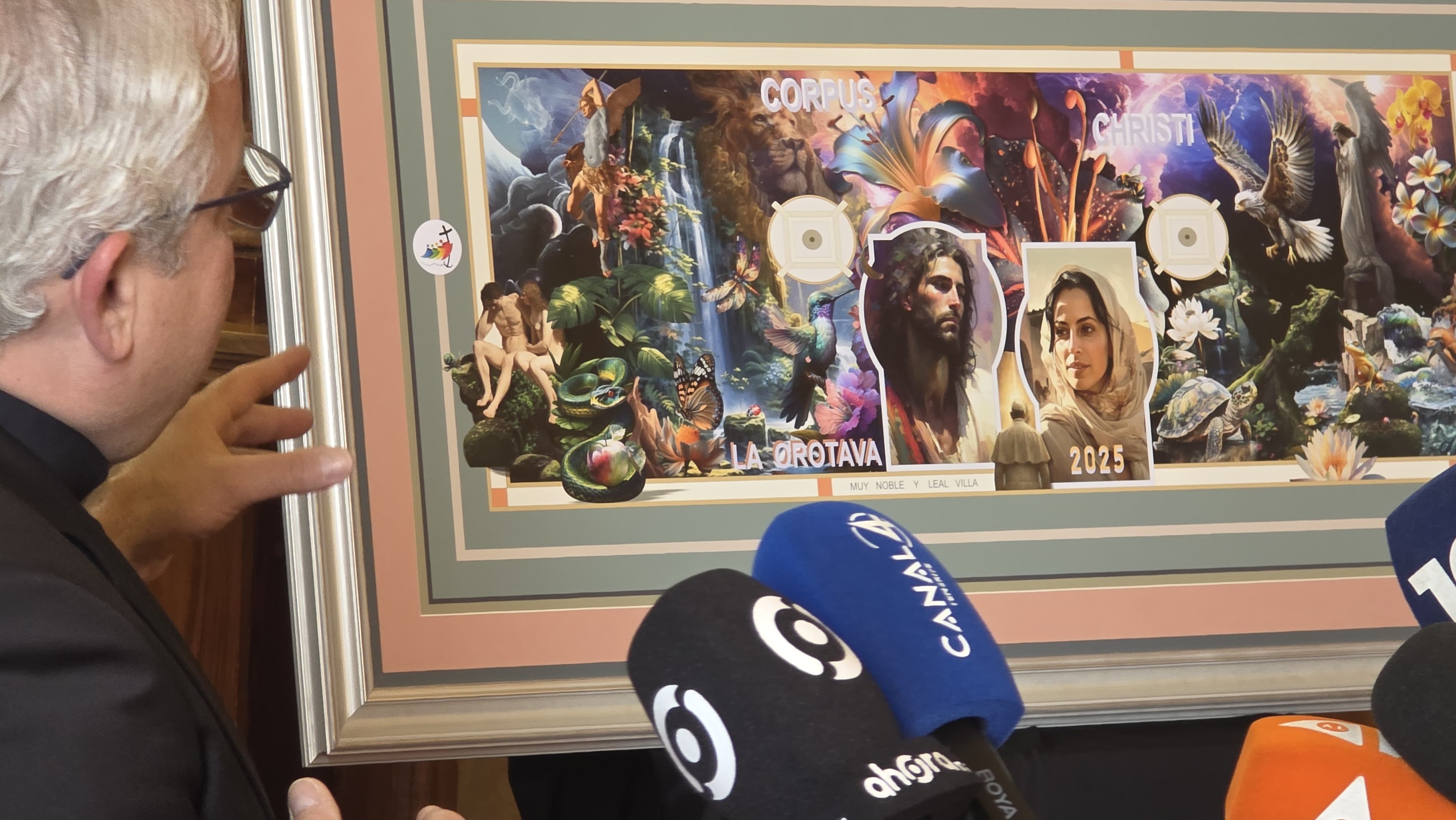 El salón noble del consistorio villero acogió en la mañana de este lunes [28 de abril] la presentación del boceto del magno tapiz de la plaza del Ayuntamiento que se confecciona cada año en honor al Corpus Christi y que lleva por título ‘A las puertas del paraíso’. El director de la Alfombra, Domingo González Expósito explicó los detalles acompañado del alcalde Francisco Linares, el concejal de Fiestas, Alexis Pacheco y el cura párroco de la Iglesia de La Concepción, Honorio J. Campos. En el acto también se contó con representantes de la Asociación de Alfombristas y miembros del colectivo Artearena. En la primera quincena de mayo se comenzará con la instalación de las carpas y marcar los primeros trazos.