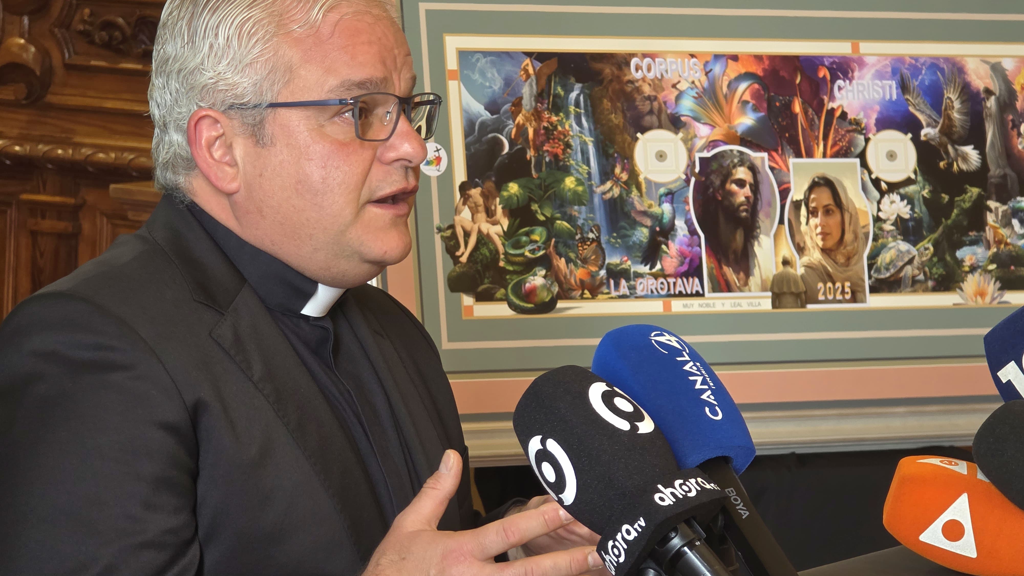 González Expósito detalló que la Alfombra de este año es una continuación de la del pasado 2024 (A las puertas del cielo). Es también un solo tapiz “en el que la compleja composición de un cúmulo de figuras hace pensar en el momento de la Creación, los cielos, constelaciones y estrellas; los animales, ríos y mares. Y la mujer y el hombre. En resumen y como el título dice, estamos a las Puertas del Paraíso”.