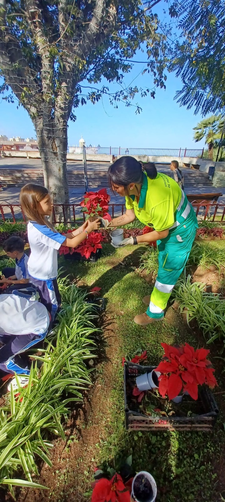 Niños del colegio de La Milagrosa participan con los jardineros municipales en la plantación de las flores de pascua