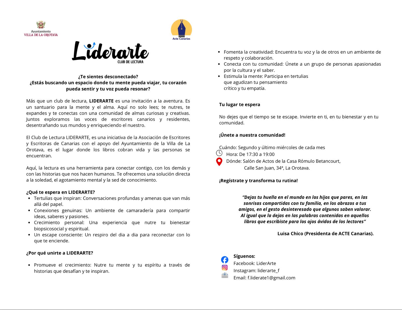 Cada encuentro es una oportunidad para descubrir nuevas voces, dialogar sobre historias que nos transforman y crear comunidad. Una iniciativa impulsada por la Asociación de Escritores y Escritoras de Canarias con el apoyo del Ayuntamiento de La Orotava.