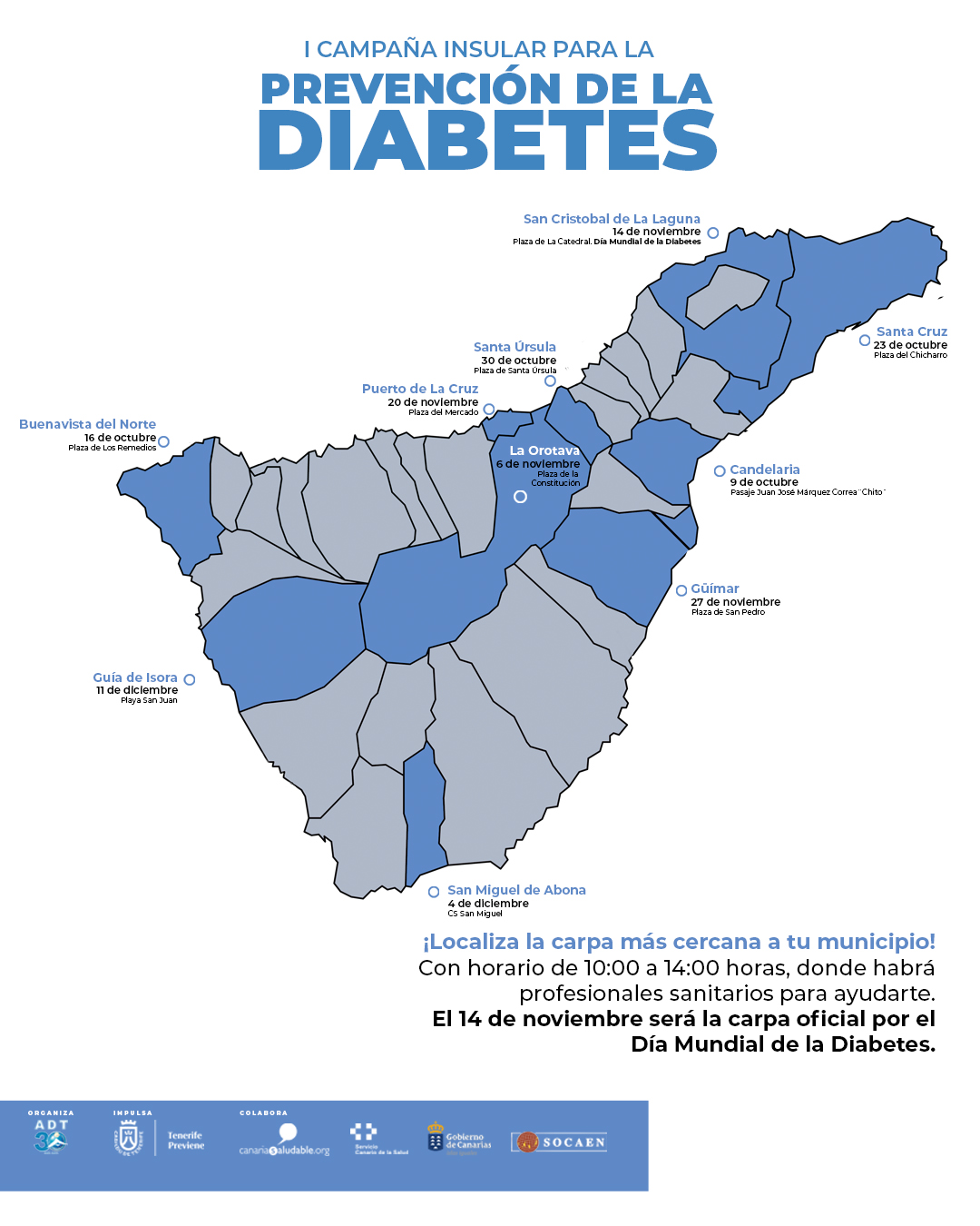 El próximo 6 de noviembre de 2025, podrán localizará en la Plaza de la Constitución la carpa de la I Campaña Insular de Prevención de la Diabetes, donde habrá profesionales sanitarios de 10 a 14 h. para informarte sobre esta enfermedad y ayudarte.