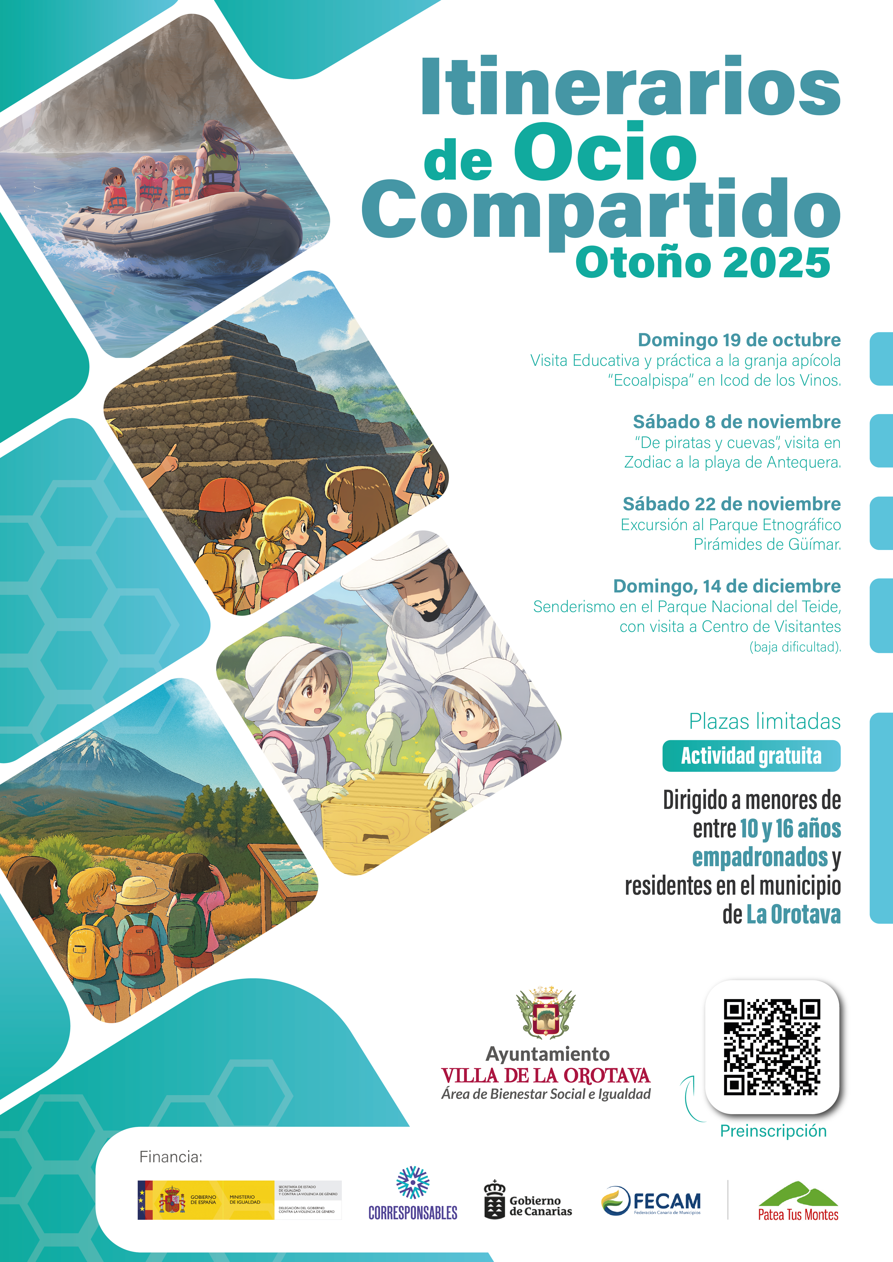El Ayuntamiento de La Orotava, a través del Área de Bienestar Social e Igualdad, pone en marcha una nueva edición de los Itinerarios de Ocio Compartido – Otoño 2025, un programa gratuito dirigido a menores de entre 10 y 16 años empadronados en el municipio.