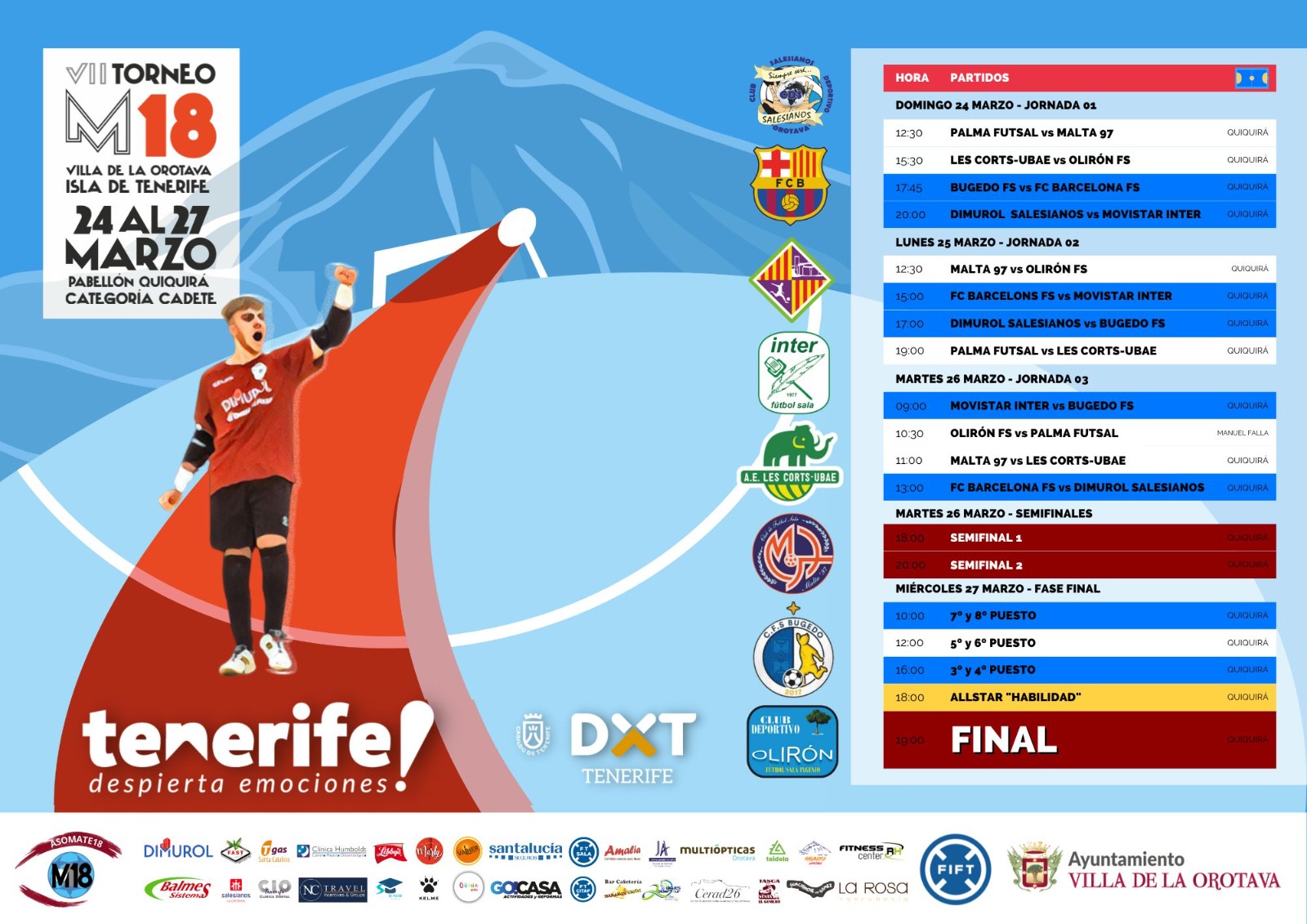 VII Torneo M18 | Categoría Cadete Cuándo: Dom, 24 Marzo 2024 Dónde: Pabellón Quiquirá VII Torneo M18 | Categoría Cadete Del 24 al 27 de marzo, en el Pabellón Quiquirá Con la participación de Club Deportivo Salesiano "Orotava", FC Barcelons FS, Inter Fútbol Sala, A.E. Les Corts-Ubae, C.F.S Bugedo, Club Deportivo Olirón, Malta 97 y Palma Futsal. Ver más