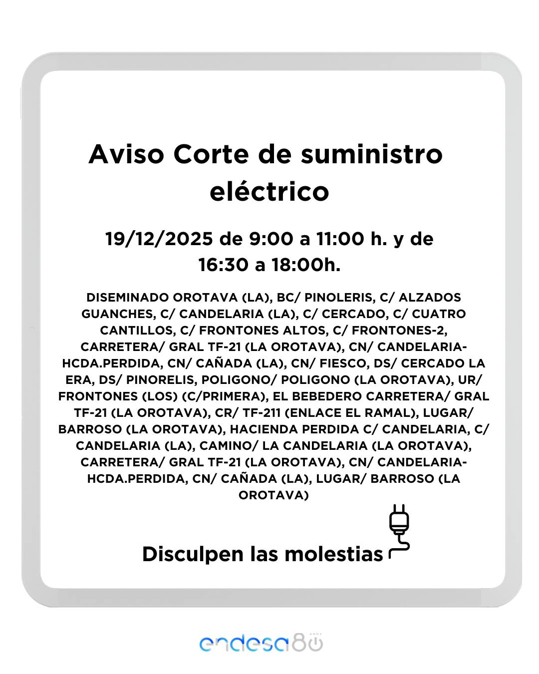 Periodo de afectación: 19/12/2025 de 09:00 a 11:00h y de 16:30 a 18:00h.