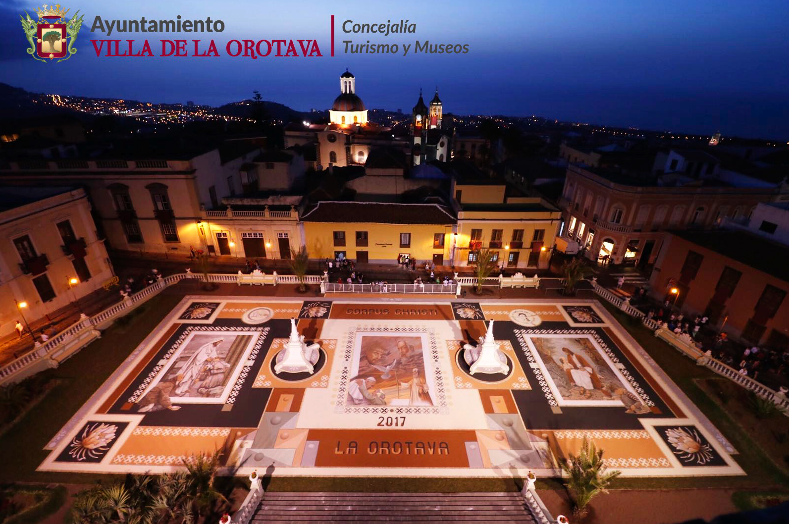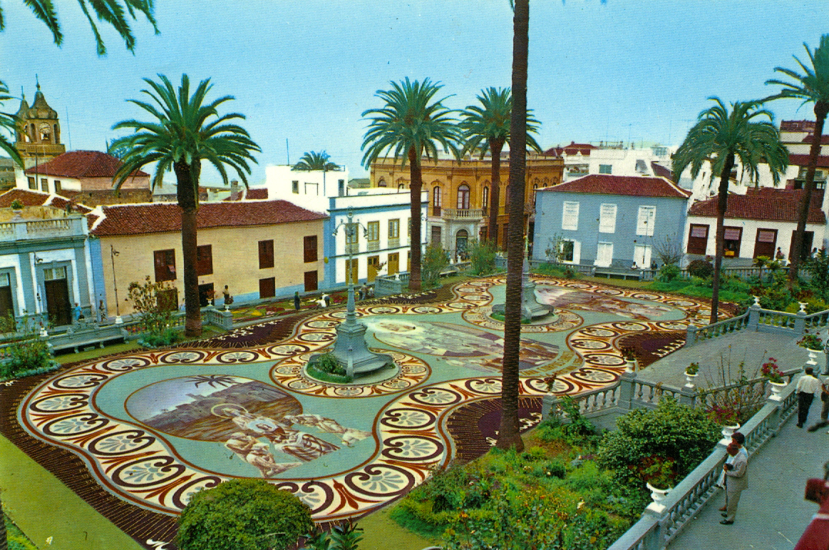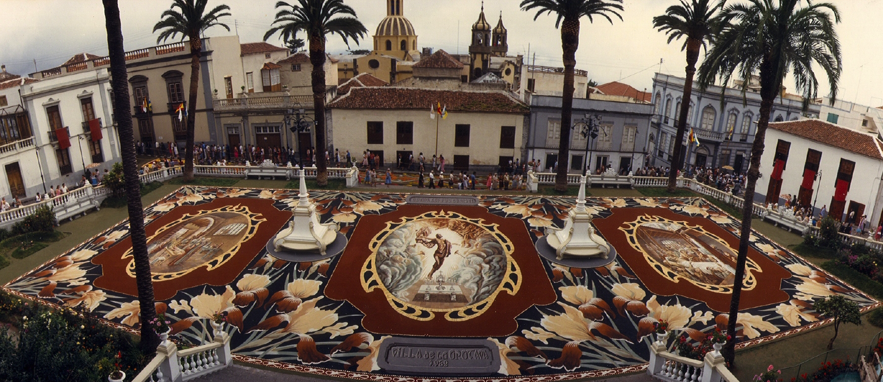 En el contexto de la Villa de La Orotava sólo una Alfombra utiliza las tierras volcánicas del Parque Nacional del Teide para su confección. Se trata de la Alfombra por excelencia, la que desde el año 1919 se hace en la explanada que proporciona la Plaza del Ayuntamiento. Este tapiz se ha convertido con el paso de los años en la expresión más cualificada del alfombrismo orotavense, ya que en ella por darse el culmen del acto litúrgico, se concentran todos los esfuerzos humanos y artísticos. Cuando en 1919 se dispuso de un amplio recinto, frente a las Casas Consistoriales, las autoridades religiosas y civiles tomaron el acuerdo de modificar el recorrido original de la procesión para hacer una parada sobre un nuevo tapiz que allí se confeccionaría. La Plaza ya había sido utilizada para honrar la visita de la Marina española (1905) y dar la bienvenida a Alfonso XIII (1906). El espacio se cedió al alfombrista más prestigioso del momento, Felipe Machado, quien aceptó con sumo agrado. El señor Machado empezó su tarea confeccionando la Alfombra con flores, como era tradición, pero poco a poco y ante la amplia superficie que debía cubrir dio paso al uso de tierras volcánicas y otros materiales (troncos, conchas marinas…). Las flores fueron desapareciendo hasta llegar al triunfo de las arenas volcánicas, con una gama amplia de colores que se utilizan en estado puro, o mezclados entre sí. El período de ejecución se ha ido prolongando y en la actualidad el inicio de la confección y de los bocetos se plantea con meses de antelación a la celebración del Corpus Christi. El alfombrismo orotavense ha experimentado una continua conquista en los terrenos de la estética y aunque éste siempre se mueve en los cánones del arte barroco, los detalles de vanguardismo han marcado una clara evolución positiva.