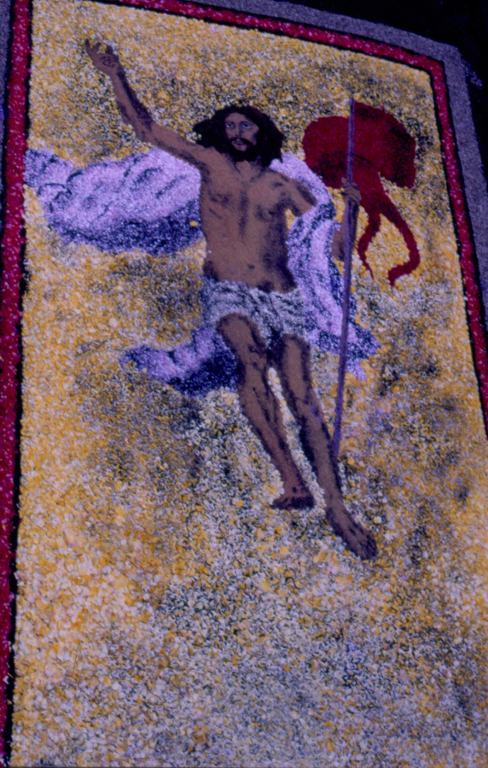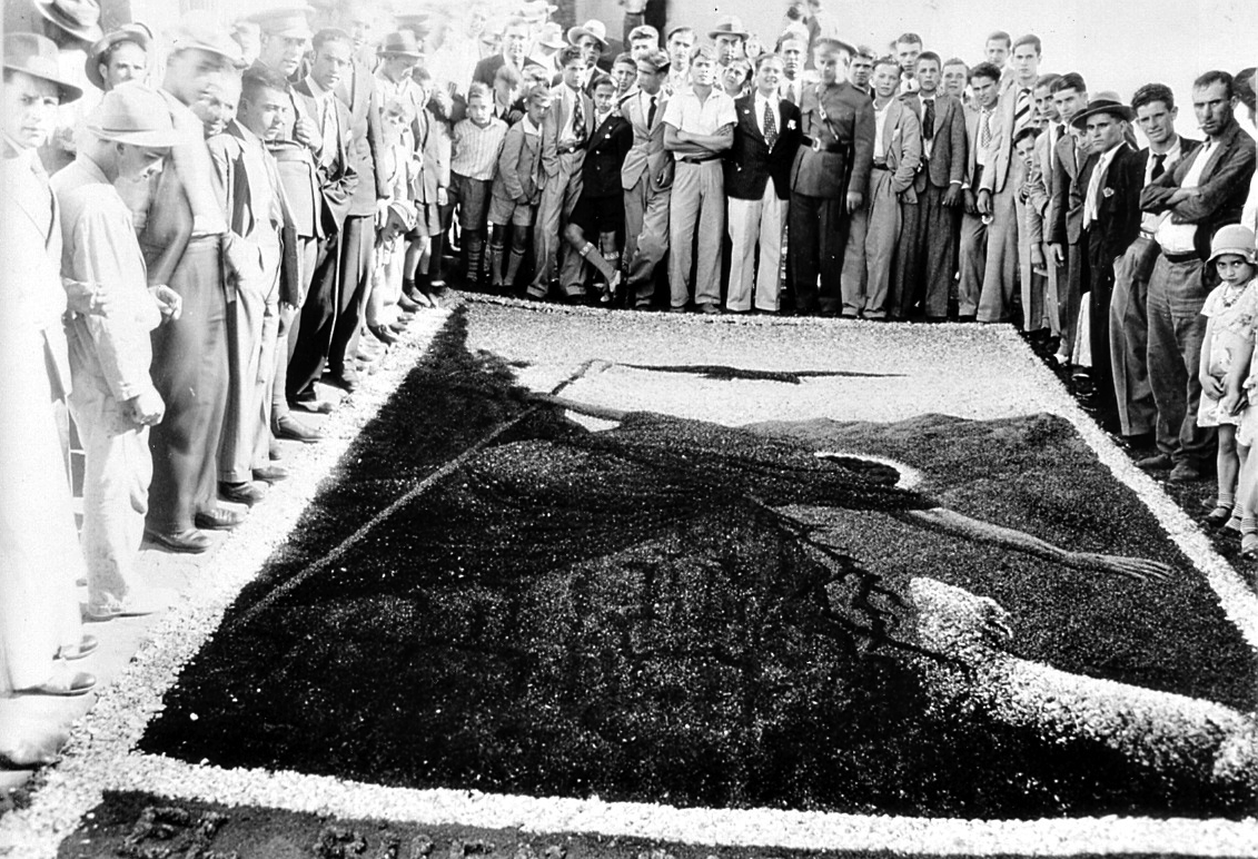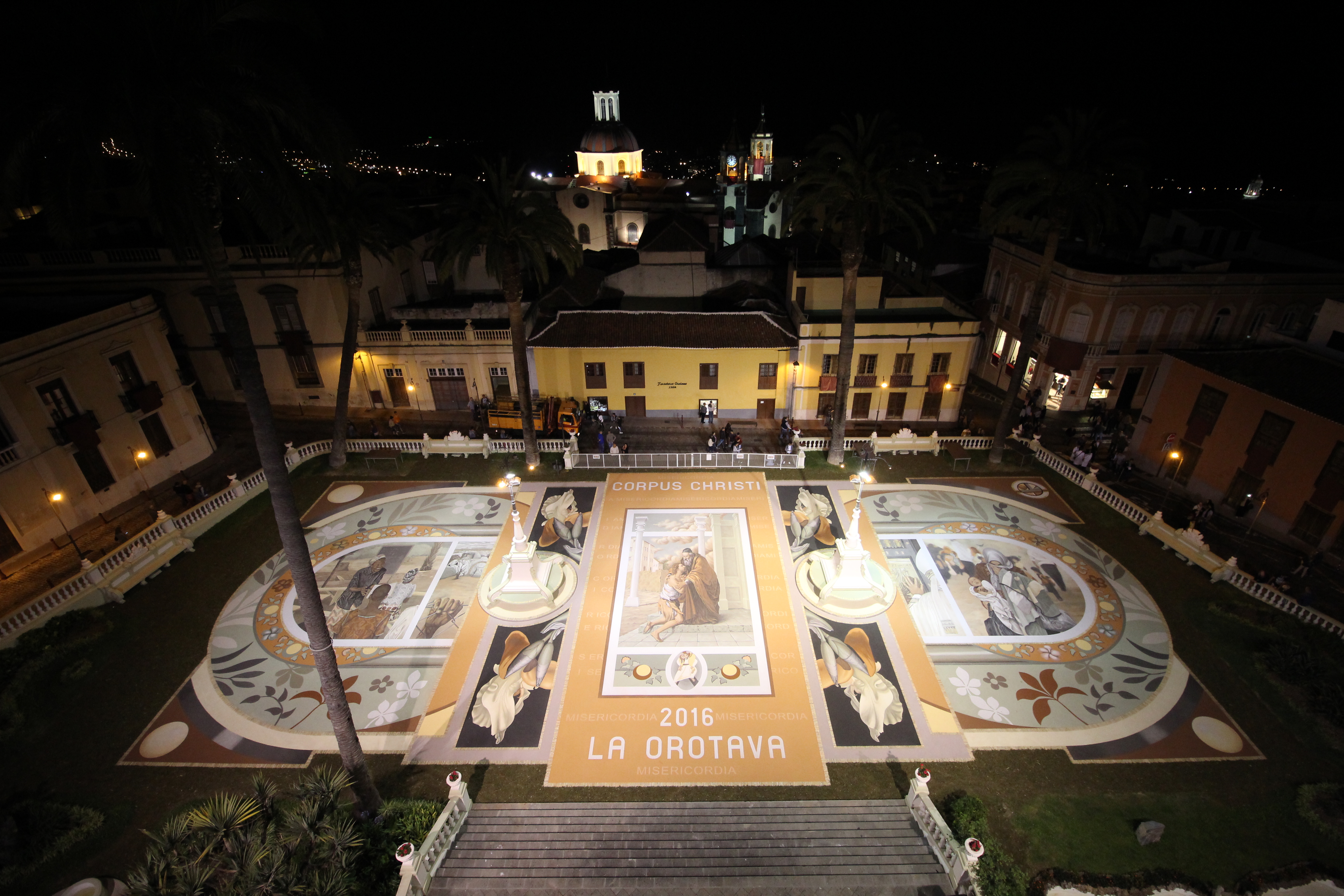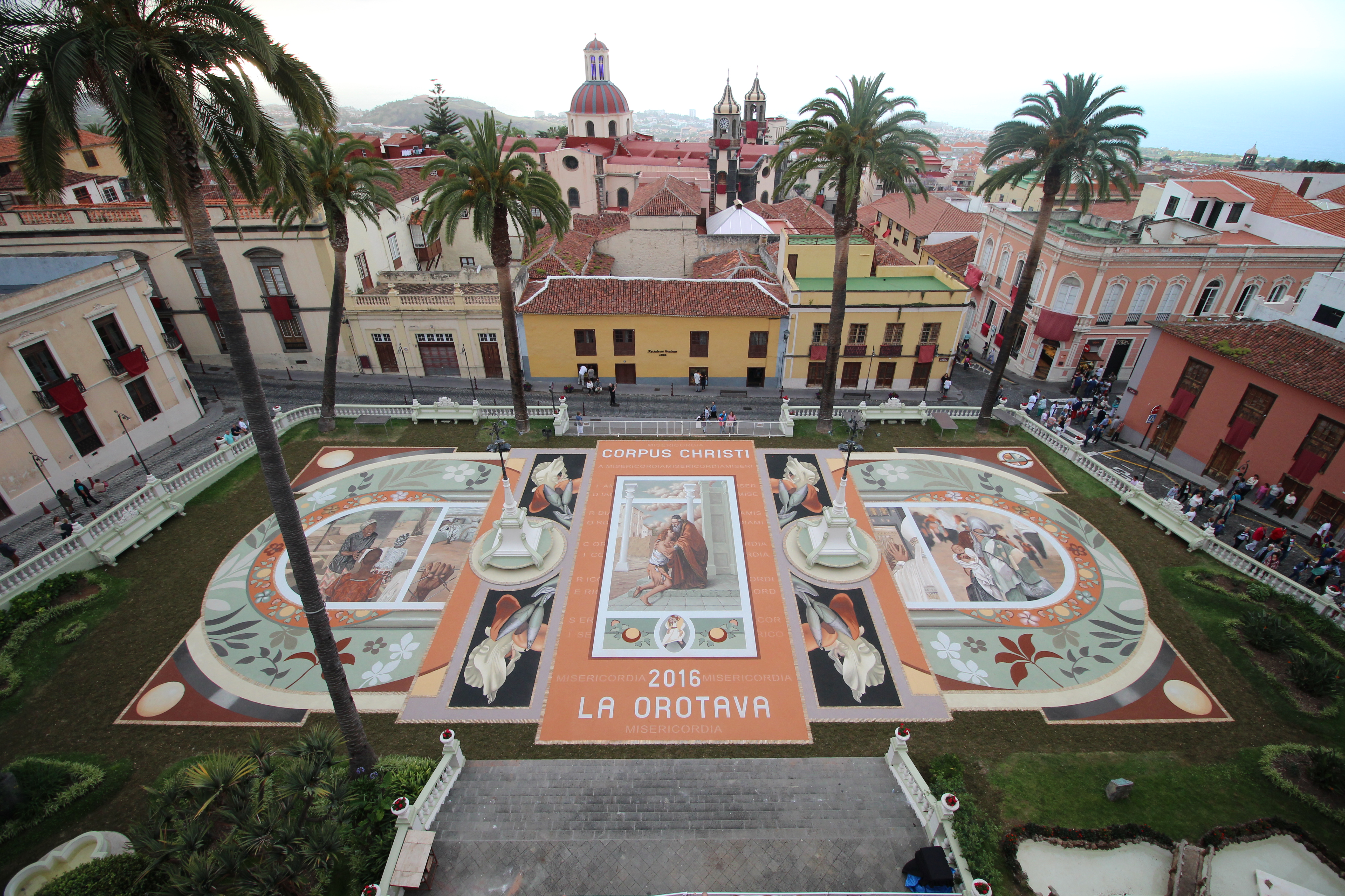 En el contexto de la Villa de La Orotava sólo una Alfombra utiliza las tierras volcánicas del Parque Nacional del Teide para su confección. Se trata de la Alfombra por excelencia, la que desde el año 1919 se hace en la explanada que proporciona la Plaza del Ayuntamiento. Este tapiz se ha convertido con el paso de los años en la expresión más cualificada del alfombrismo orotavense, ya que en ella por darse el culmen del acto litúrgico, se concentran todos los esfuerzos humanos y artísticos. Cuando en 1919 se dispuso de un amplio recinto, frente a las Casas Consistoriales, las autoridades religiosas y civiles tomaron el acuerdo de modificar el recorrido original de la procesión para hacer una parada sobre un nuevo tapiz que allí se confeccionaría. La Plaza ya había sido utilizada para honrar la visita de la Marina española (1905) y dar la bienvenida a Alfonso XIII (1906). El espacio se cedió al alfombrista más prestigioso del momento, Felipe Machado, quien aceptó con sumo agrado. El señor Machado empezó su tarea confeccionando la Alfombra con flores, como era tradición, pero poco a poco y ante la amplia superficie que debía cubrir dio paso al uso de tierras volcánicas y otros materiales (troncos, conchas marinas…). Las flores fueron desapareciendo hasta llegar al triunfo de las arenas volcánicas, con una gama amplia de colores que se utilizan en estado puro, o mezclados entre sí. El período de ejecución se ha ido prolongando y en la actualidad el inicio de la confección y de los bocetos se plantea con meses de antelación a la celebración del Corpus Christi. El alfombrismo orotavense ha experimentado una continua conquista en los terrenos de la estética y aunque éste siempre se mueve en los cánones del arte barroco, los detalles de vanguardismo han marcado una clara evolución positiva.