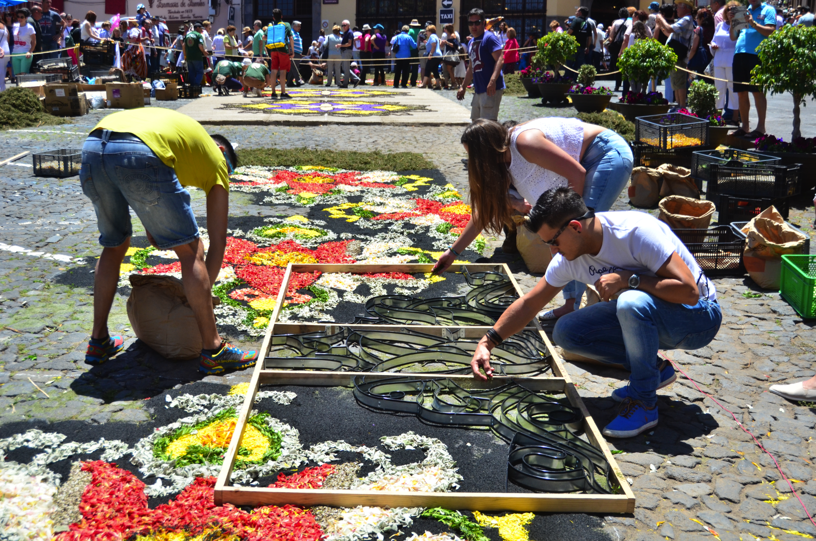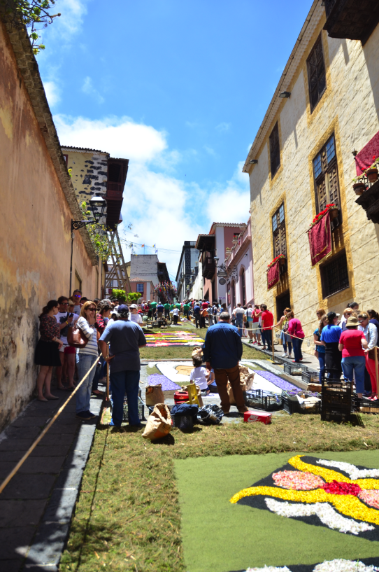 Las Alfombras no tienen otra razón de ser que su disposición para ser pisadas por el paso procesional que porta el Corpus Christi. Desde entonces hasta la actualidad el recorrido de la procesión es prácticamente el mismo: plaza Patricio García, calle Colegio, Carrera, Tomás Pérez e Inocencio García y transcurre por un piso alfombrado que ocupa unos mil doscientos metros cuadrados sobre un total de 34 alfombras de flores que intercalan tapices y corridos, más el gran tapiz de arenas volcánicas de la Plaza del Ayuntamiento, Récord Guinness en el año 2007, como la pintura de arenas naturales más grande del mundo, con 859,42 m2.