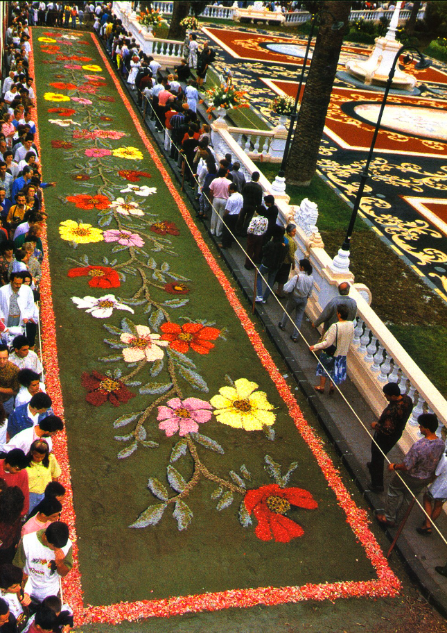Con el interés por recuperar el antiguo esplendor que había tenido la festividad del Corpus en La Orotava doña Leonor del Castillo, quien había contraído matrimonio con el villero Juan Monteverde, tuvo la genial idea de reproducir frente a su casa de la calle Colegio una alfombra de flores. La primera fue la realizada en 1847, una sencilla obra que reproducía un dibujo geométrico de estilo barroquizante y que utilizó como soporte el suelo adoquinado de la vía. Sobre el trazado se depositaron los pétalos de flores deshojados y esta iniciativa sorprendió de tal manera a la sociedad orotavense que pronto encontraron muchos adeptos entre la aristocracia local. Se establecieron así los principios artísticos de una manifestación floral que se consolidó como la tradición que más fama ha dado a La Orotava.