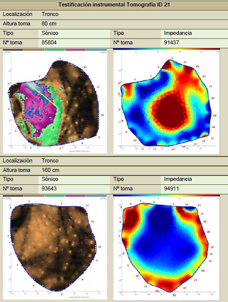 Tras el análisis técnico, se concluye la necesidad de talar dos araucarias, en concreto las identificadas como ejemplar nº 5 y nº 21, ambas clasificadas en el nivel de riesgo D (riesgo estático muy elevado), lo que implica defectos estructurales graves y elevada pudrición que podrían provocar vuelco o fractura inminente. Por este motivo, la recomendación técnica establece que la intervención debe ser inmediata.