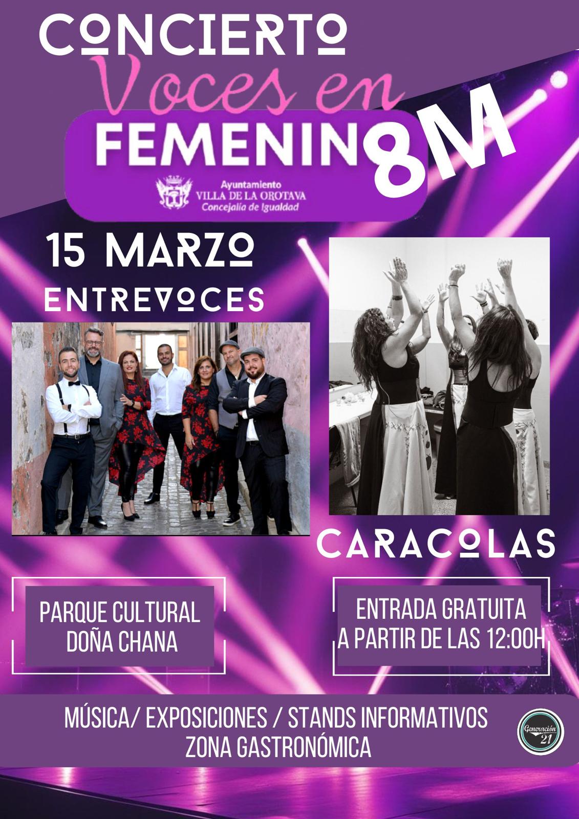 El Parque Cultural de Doña Chana acogerá el sábado 15 el concierto “Voces en femenino”, a partir del mediodía, en el que intervendrán los grupos “Caracolas” y “Entrevoces”. Junto al concierto el público asistente podrá disfrutar de la exposición “mujeres sin límites”, durante toda la jornada.