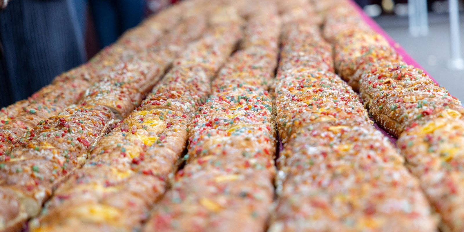 En esta decimotercera edición el gran dulce estará compuesto por 500 piezas de roscones que unidas de forma lineal miden casi 500 metros de longitud. La masa se realizará, un año más, en las instalaciones de la Panadería Jovita, mientras que los 1.000 kilos de crema pastelera del relleno los aporta la dulcería la Manobuena. Para la elaboración de este tradicional dulce navideño se utilizan, entre otros ingredientes, unos 300 kilos de harina; más de 50 kilos de naranja y otros tantos de diversa fruta confitada; margarina; mantequilla; azúcar; vainilla y limón. También se repartirán unos 500 litros de chocolate caliente.