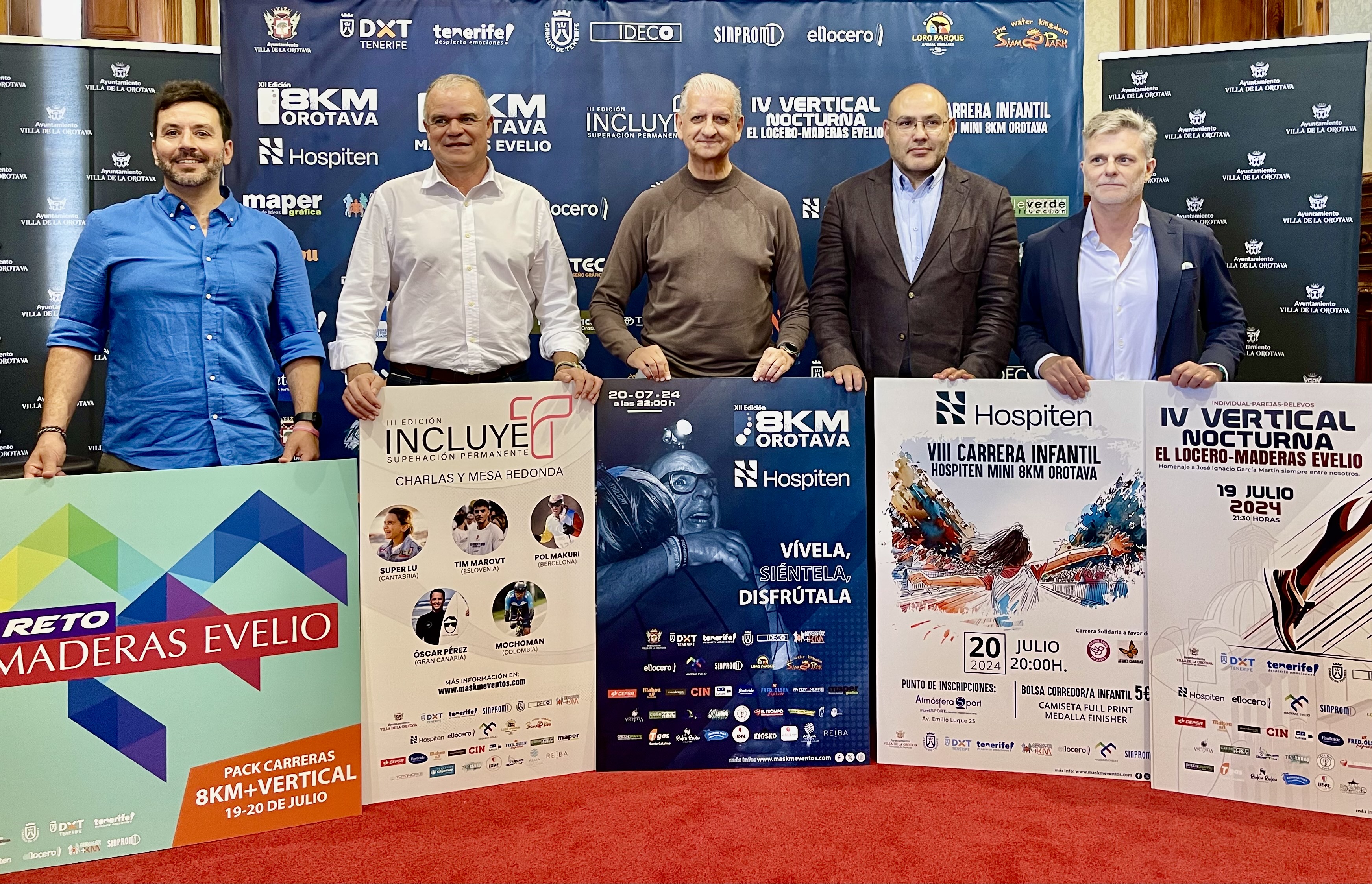 La Hospiten 8KM Orotava, prueba que celebra su XII edición el próximo 20 de julio en el callejero de la Villa, ha sido presentada este lunes, día 8 de julio, en el Ayuntamiento de La Orotava. El acto estuvo presidido por Francisco Linares, alcalde del municipio que actuará como anfitrión desde el 15 de julio, cuando comienza el programa de actos. La inclusión de personas con algún tipo de discapacidad, el principal objetivo de la Asociación Deportiva +Km.