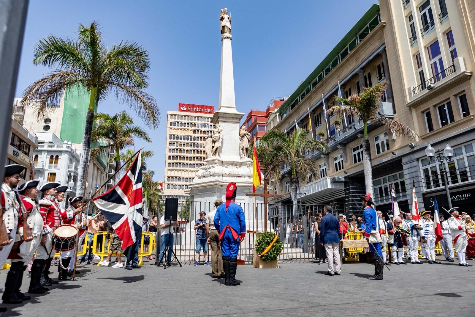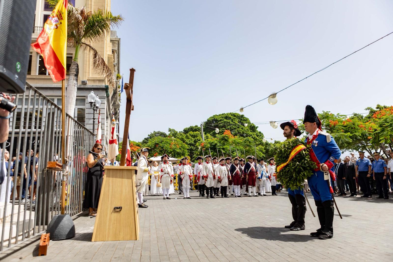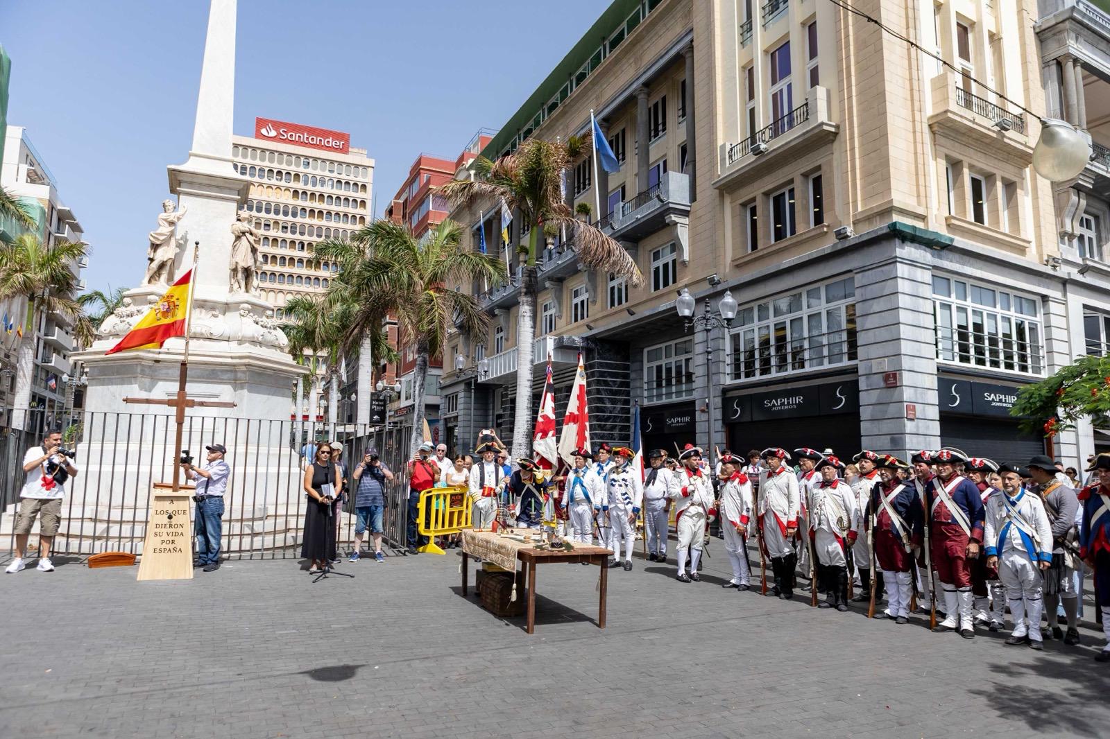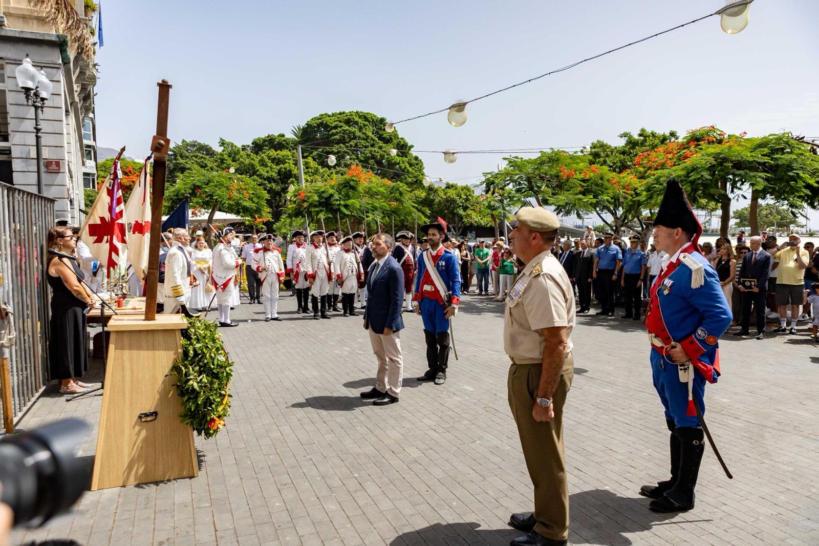 Santa Cruz de Tenerife conmemora en estos días la Gesta del 25 de julio de 1797. La defensa de la isla frente al ataque británico liderado por Nelson contó con la participación de soldados de La Orotava, tanto milicianos como pertenecientes al batallón de infantería. Estos soldados se unieron a las fuerzas defensoras de la ciudad, contribuyendo a la victoria canaria. Entre los actos que organiza la Asociación Histórico-Cultural Gesta del 25 de Julio de 1797, la Plaza de La Candelaria de la capital tinerfeña acogió este domingo [27 de julio] la conmemoración del ‘Acto de Firma de las Capitulaciones’, con una narración histórica y una representación teatralizada del momento de la firma, así como la entrega de Medallas de la Gesta. El alcalde de la Villa, Francisco Linares, ha recogido la distinción que se le otorga al municipio de La Orotava reconociendo la importancia de la colaboración y el valor de los diferentes cuerpos militares y civiles en la defensa de la ciudad. La jornada culminó con un homenaje a los caídos, interpretación musical de la Banda Municipal de Música de Santa Cruz de Tenerife con himnos de España, Francia e Inglaterra, una ofrenda floral en el monolito del monumento de La Candelaria y una descarga final de salvas.