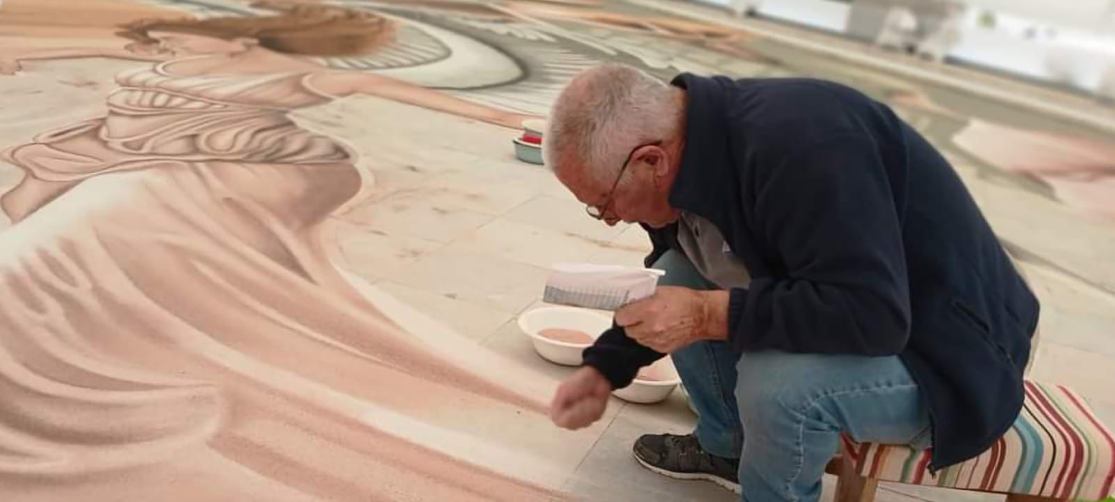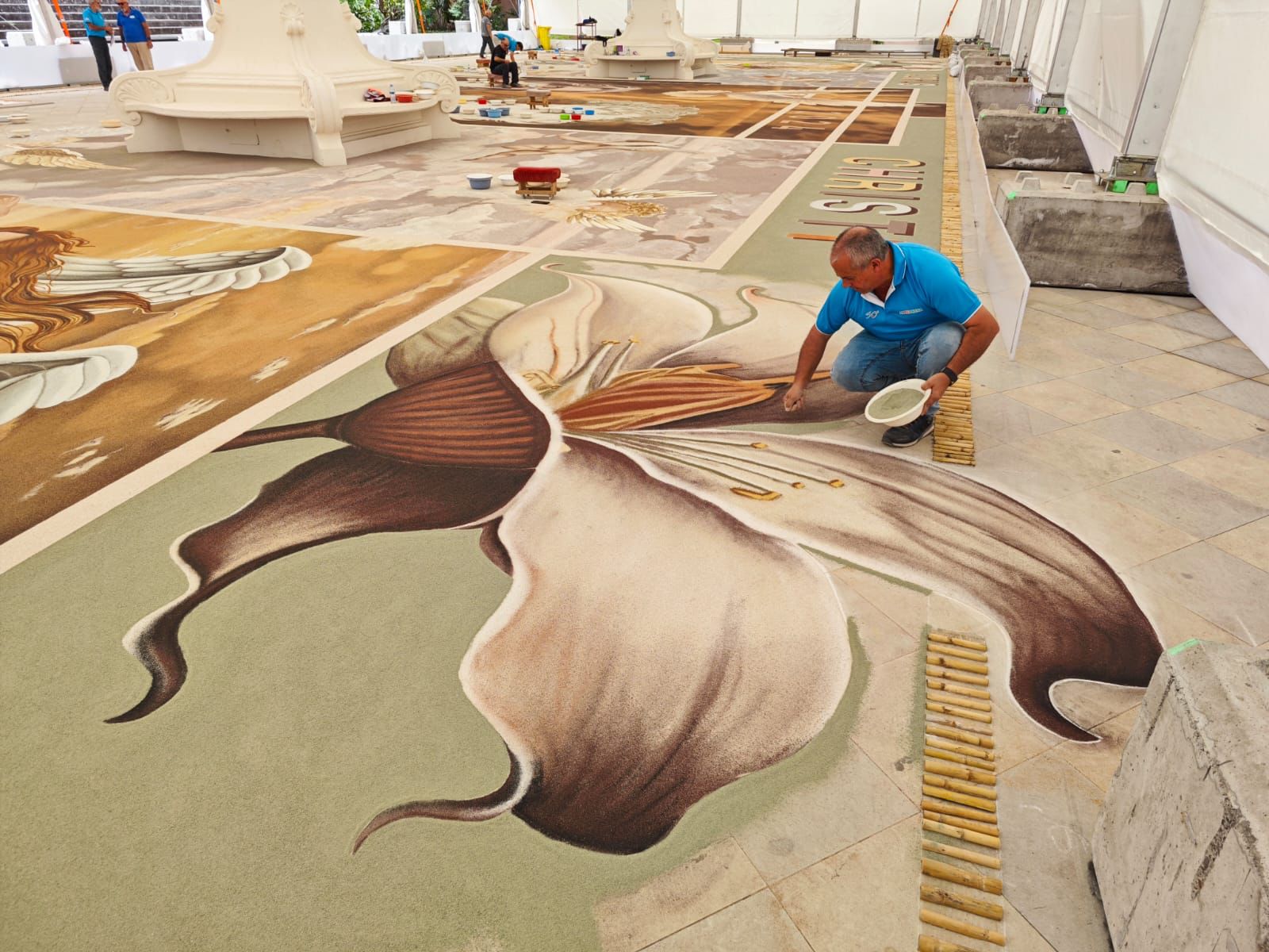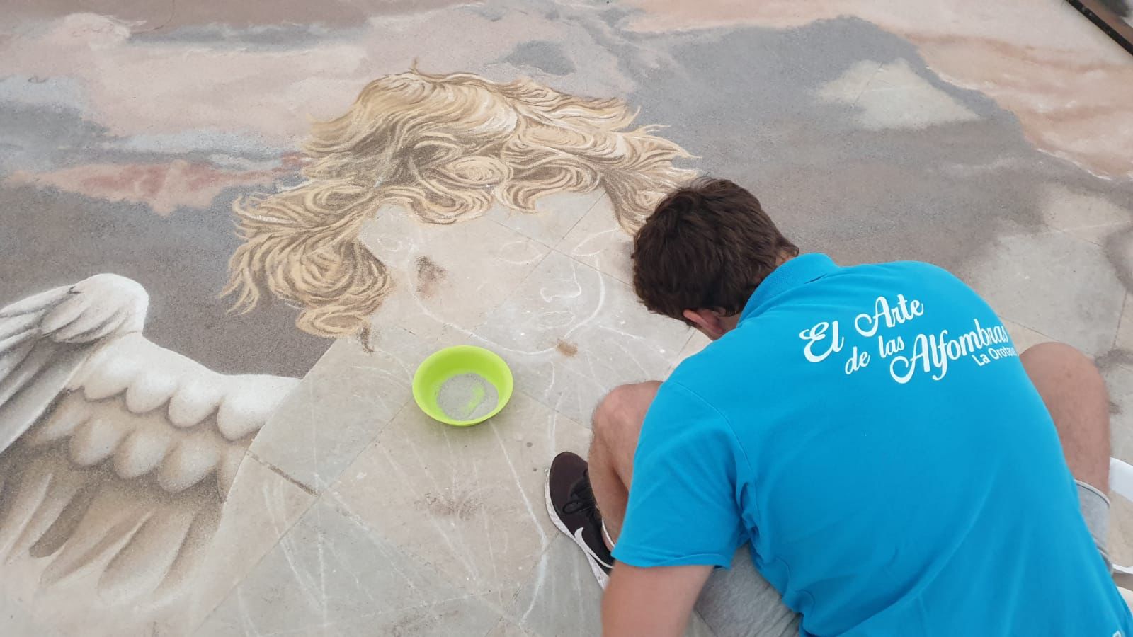 Los maestros alfombristas, embajadores de nuestro arte efímero, ya se encuentran con los últimos detalles del magno tapiz confeccionado con arenas naturales del parque nacional del Teide.