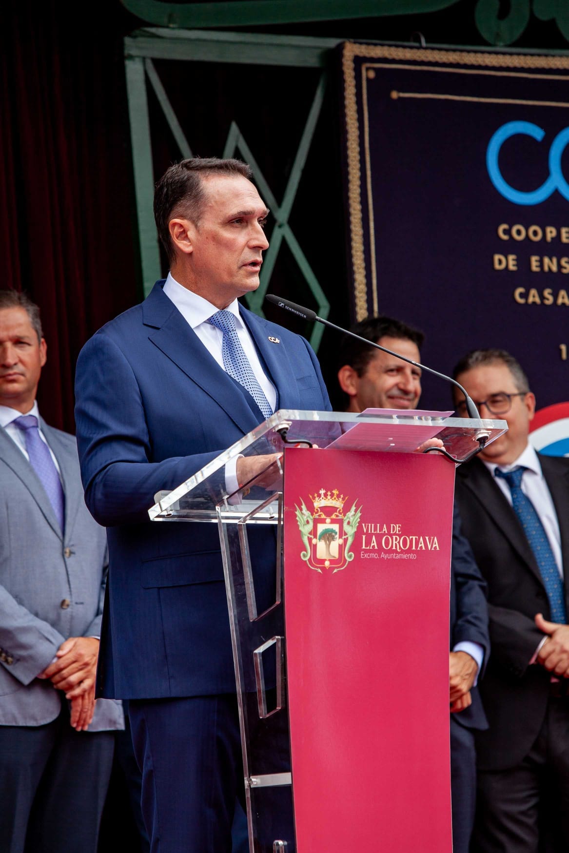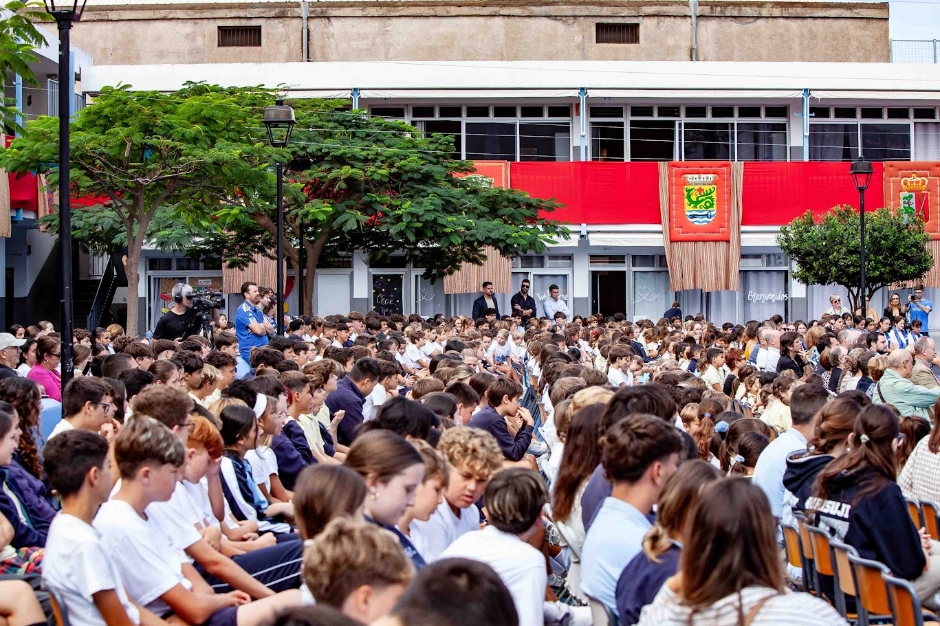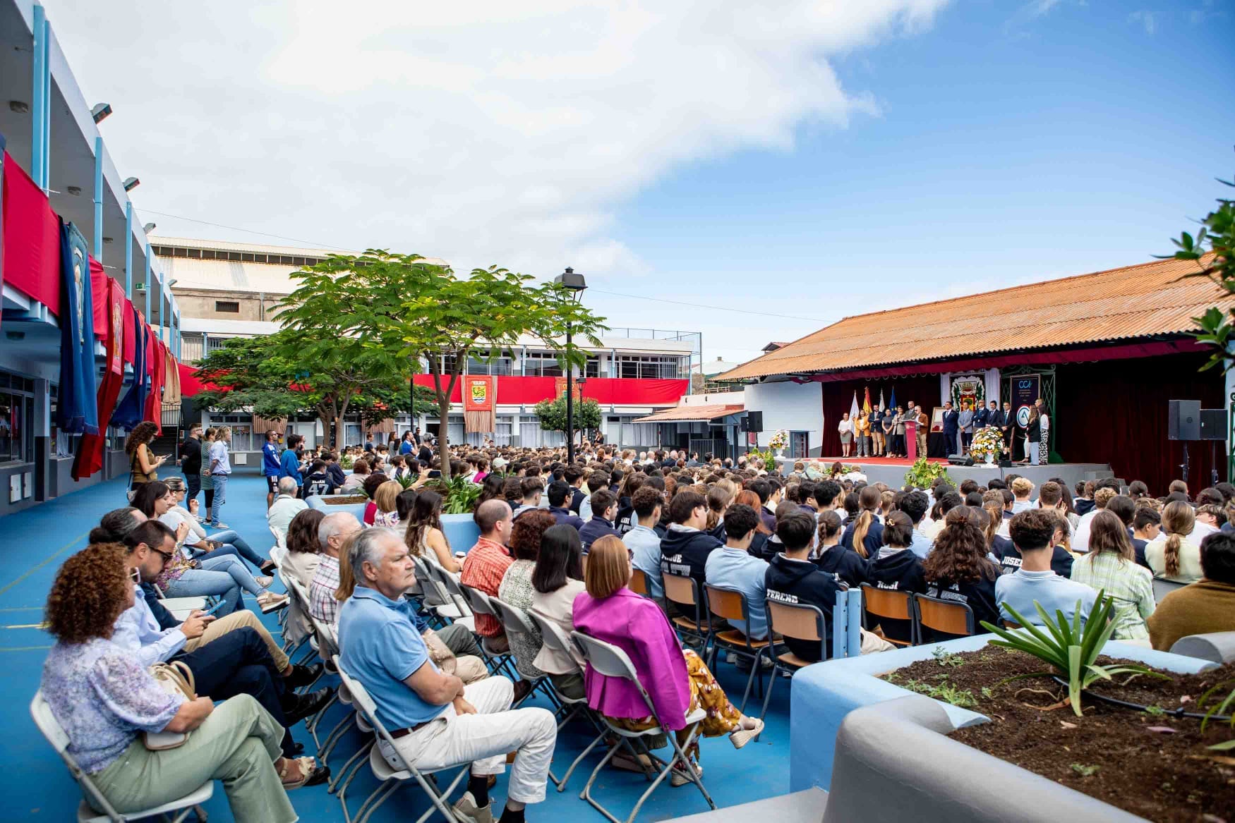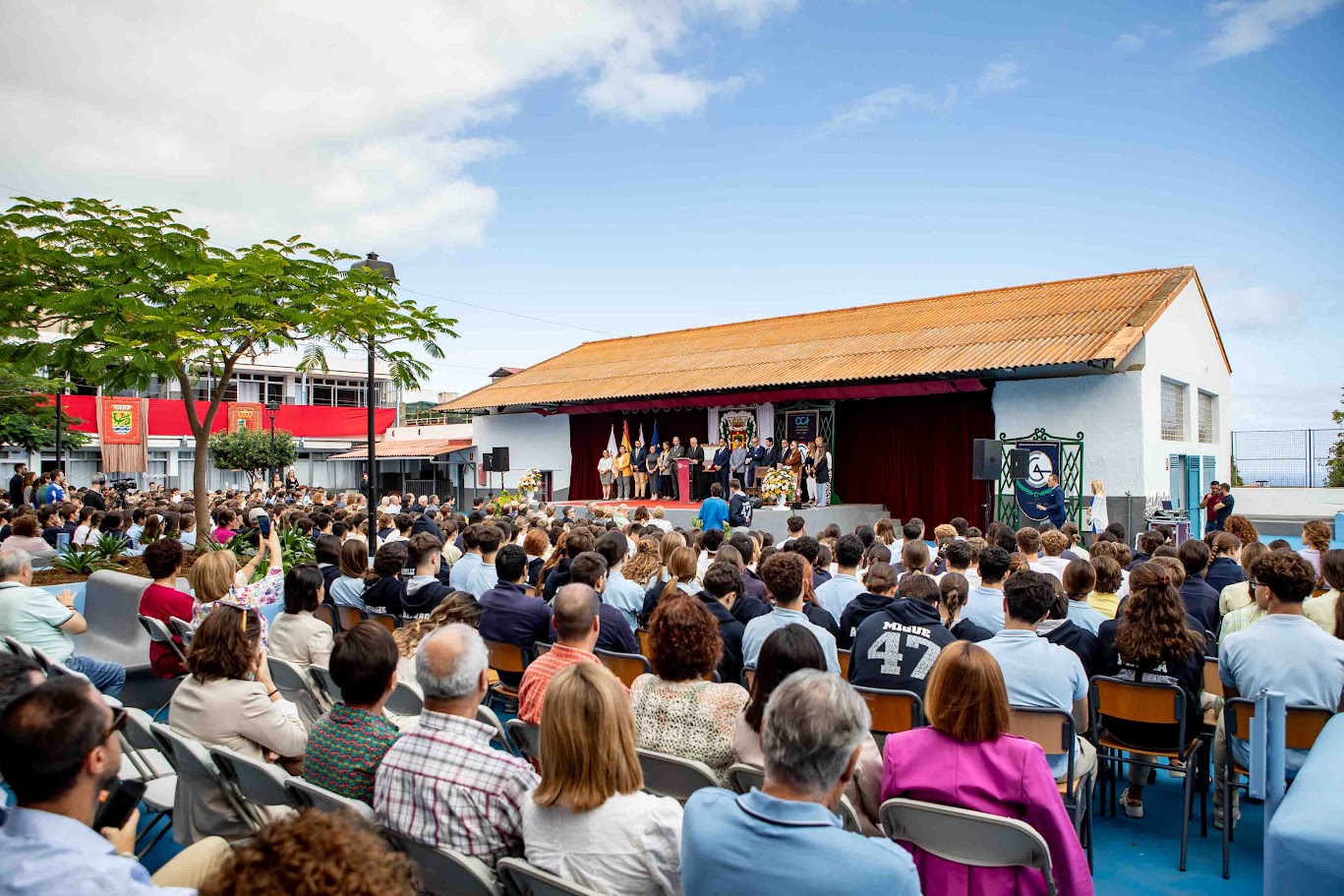 El acto, celebrado en el espacio central del colegio, fue presidido por el alcalde de la Villa Francisco Linares y el director del centro Federico Rodríguez, acompañados de otros miembros de la corporación municipal y representantes de los órganos sociales del colegio, de la asamblea general, del consejo rector, el equipo directivo, alumnos y alumnas, docentes, exalumnos y padres y madres. También asistió Leopoldo Afonso, alcalde de Puerto, y otros miembros de la corporación portuense, ya que el centro con cerca de 700 estudiantes que van desde infantil de 3 años hasta 2º de Bachiller, se encuentra en el límite con la ciudad turística y mantiene un fuerte vínculo con la misma. Durante el evento, los alumnos cantaron el himno del colegio, y también se contó con actuación musical de Juan Pablo Pérez con el timple, acompañado de Marco del Castillo con la guitarra.