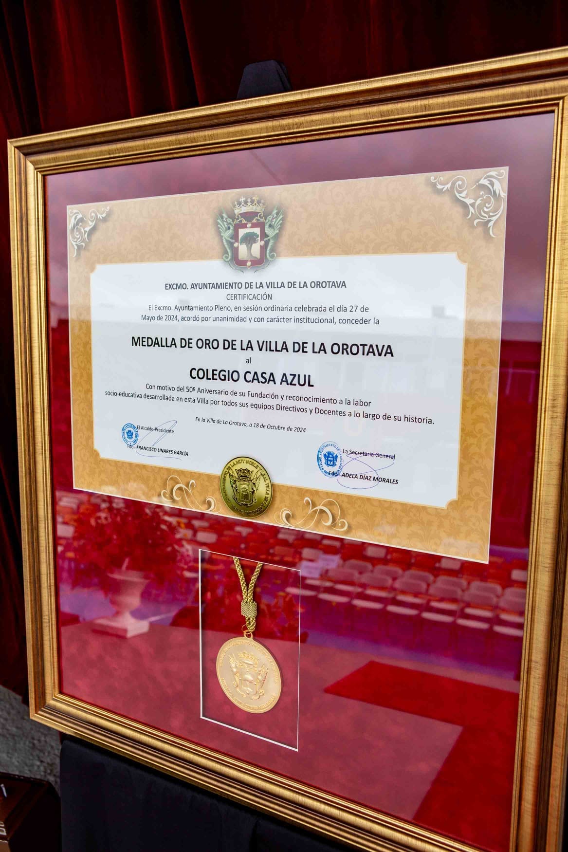 El Colegio Internacional Casa Azul ha recibido la Medalla de Oro del municipio de La Orotava en reconocimiento a su labor socio-educativa y con motivo de su cincuenta aniversario. La concesión de este reconocimiento se aprobó, por unanimidad, en el pleno de la corporación municipal celebrado el pasado mayo.