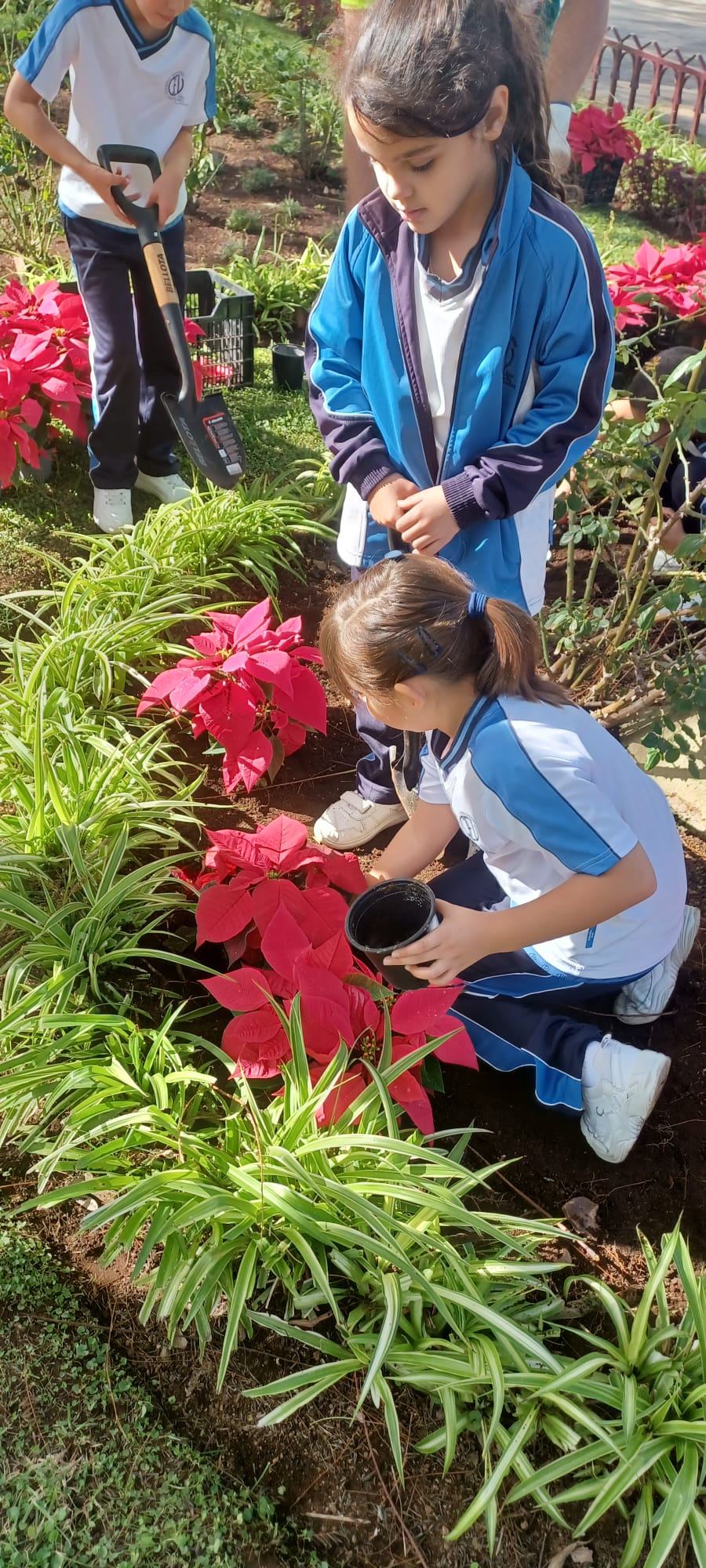 Niños del colegio de La Milagrosa participan con los jardineros municipales en la plantación de las flores de pascua