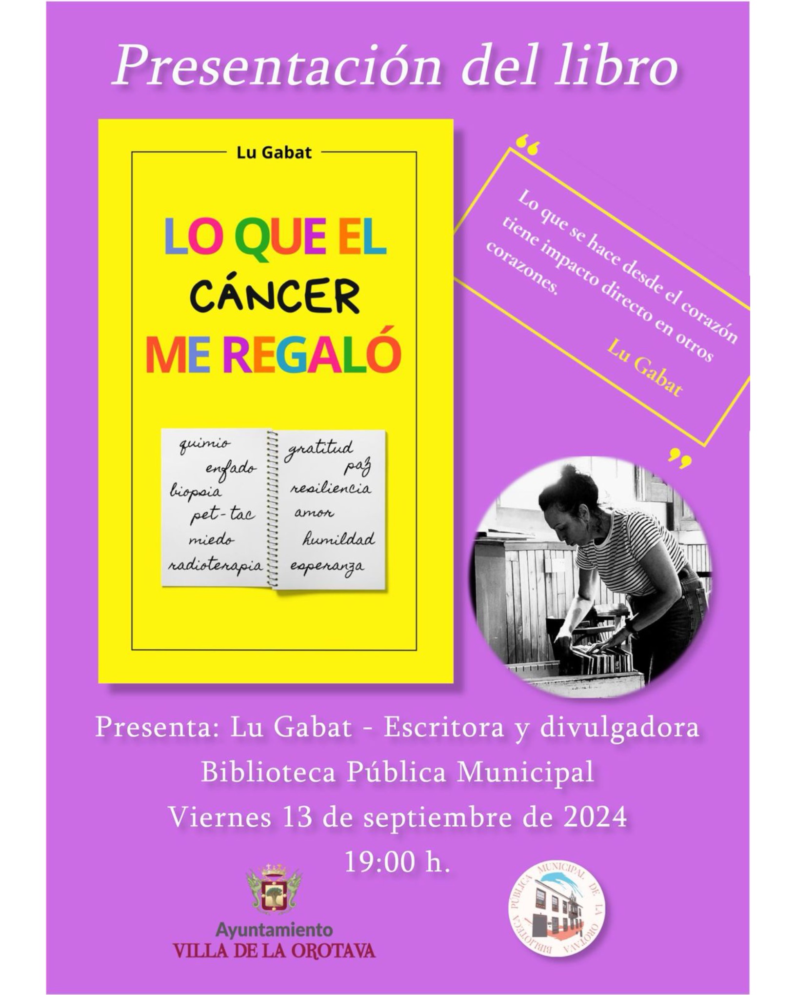 Este viernes 13 de septiembre a las 7 de la tarde, Lu Gabat presenta su libro Lo que el cáncer me regaló, en la Sala de Canarias de la Biblioteca Municipal.