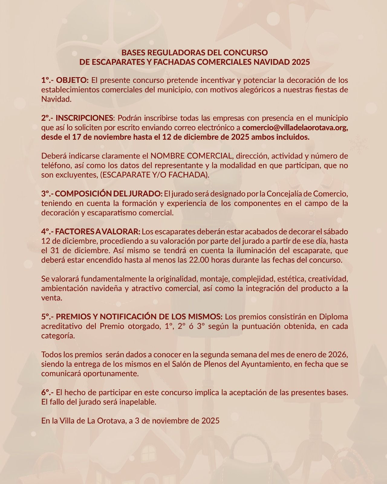 Podrán participar todas las empresas con presencia en el municipio. Las inscripciones deben realizarse por escrito enviando un correo a comercio@villadelaorotava.org, entre el 17 de noviembre y el 12 de diciembre de 2025 (ambos incluidos).