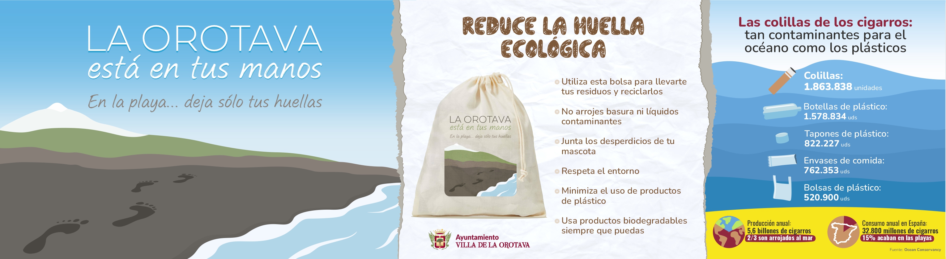 Al encontrarnos en la época estival, la campaña se desarrolla principalmente en uno de los parajes naturales del municipio que en esta fecha del año cuenta con mayor número de usuarios como es la playa de El Bollullo. En estos días se reparten unos folletos con consejos e información relativa al cuidado de las playas, la recogida de residuos, el respeto al medioambiente, el correcto uso de los contenedores, el daño ecológico que generan diferentes envases o materiales como el plástico y la contaminación que producen las colillas. También se distribuyen unas 1.000 bolsas de tela y cordón con el mensaje de la campaña: ‘La Orotava está en tus manos. En la playa deja solo tus huellas’. Estas bolsas, con un diseño representativo del municipio, son para que los usuarios de la playa las empleen para recoger los residuos que generen y así contribuir a mantenerla limpia y evitar el impacto ambiental.