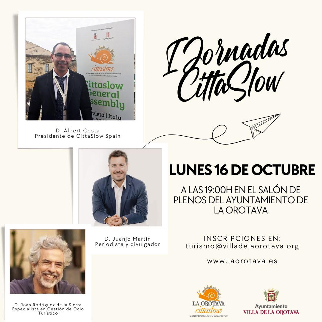 La Villa de La Orotava acogerá la próxima semana, en concreto el lunes 16 de octubre, las primeras jornadas formativas Cittaslow. Se desarrollarán, a partir de las 19.00 horas, en el salón noble de la casa consistorial y versarán sobre sostenibilidad y turismo, planteándose la perspectiva de abogar por un turismo con la filosofía del movimiento cittaslow. En esta primera edición se contará con el presidente de Cittaslow en España, Albert Costa; Joan Rodríguez de la Sierra, especialista en gestión de ocio turístico, y Juanjo Martín, periodista y divulgador. Al finalizar las charlas se celebrará una mesa redonda.