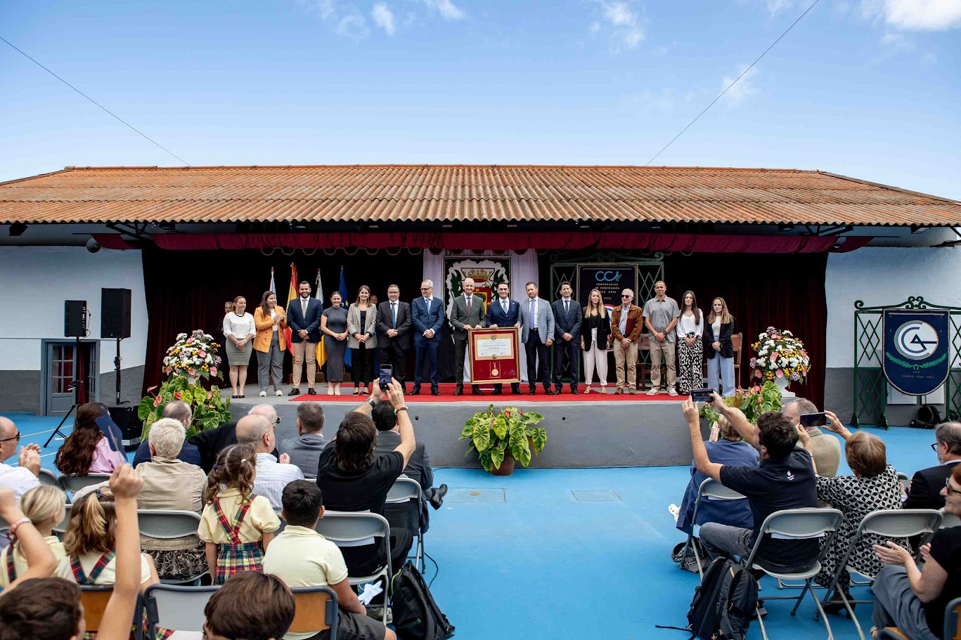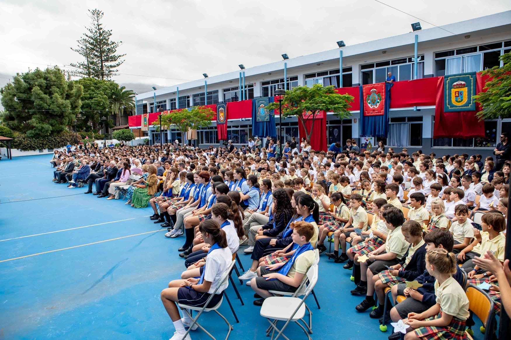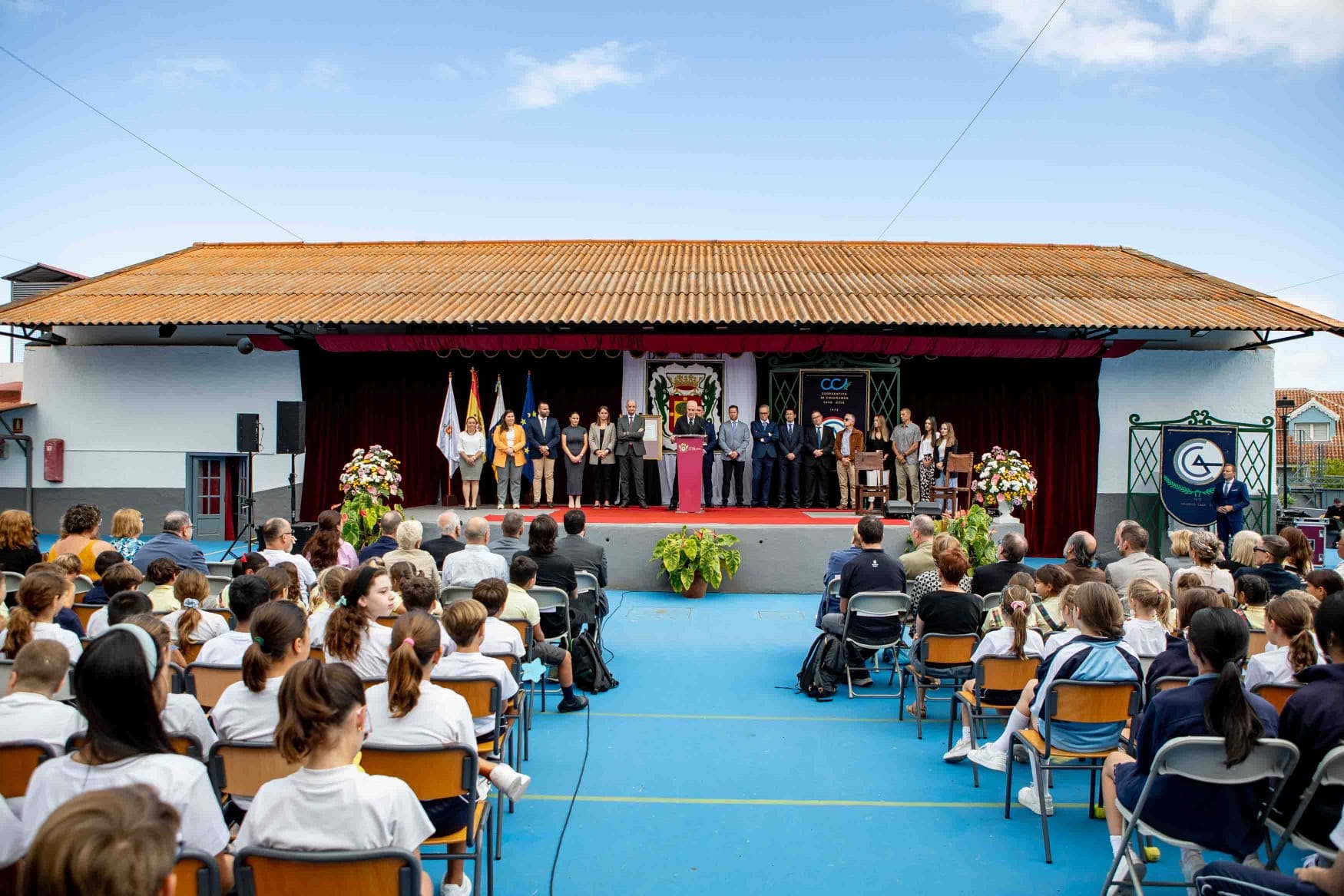 El acto, celebrado en el espacio central del colegio, fue presidido por el alcalde de la Villa Francisco Linares y el director del centro Federico Rodríguez, acompañados de otros miembros de la corporación municipal y representantes de los órganos sociales del colegio, de la asamblea general, del consejo rector, el equipo directivo, alumnos y alumnas, docentes, exalumnos y padres y madres. También asistió Leopoldo Afonso, alcalde de Puerto, y otros miembros de la corporación portuense, ya que el centro con cerca de 700 estudiantes que van desde infantil de 3 años hasta 2º de Bachiller, se encuentra en el límite con la ciudad turística y mantiene un fuerte vínculo con la misma. Durante el evento, los alumnos cantaron el himno del colegio, y también se contó con actuación musical de Juan Pablo Pérez con el timple, acompañado de Marco del Castillo con la guitarra.