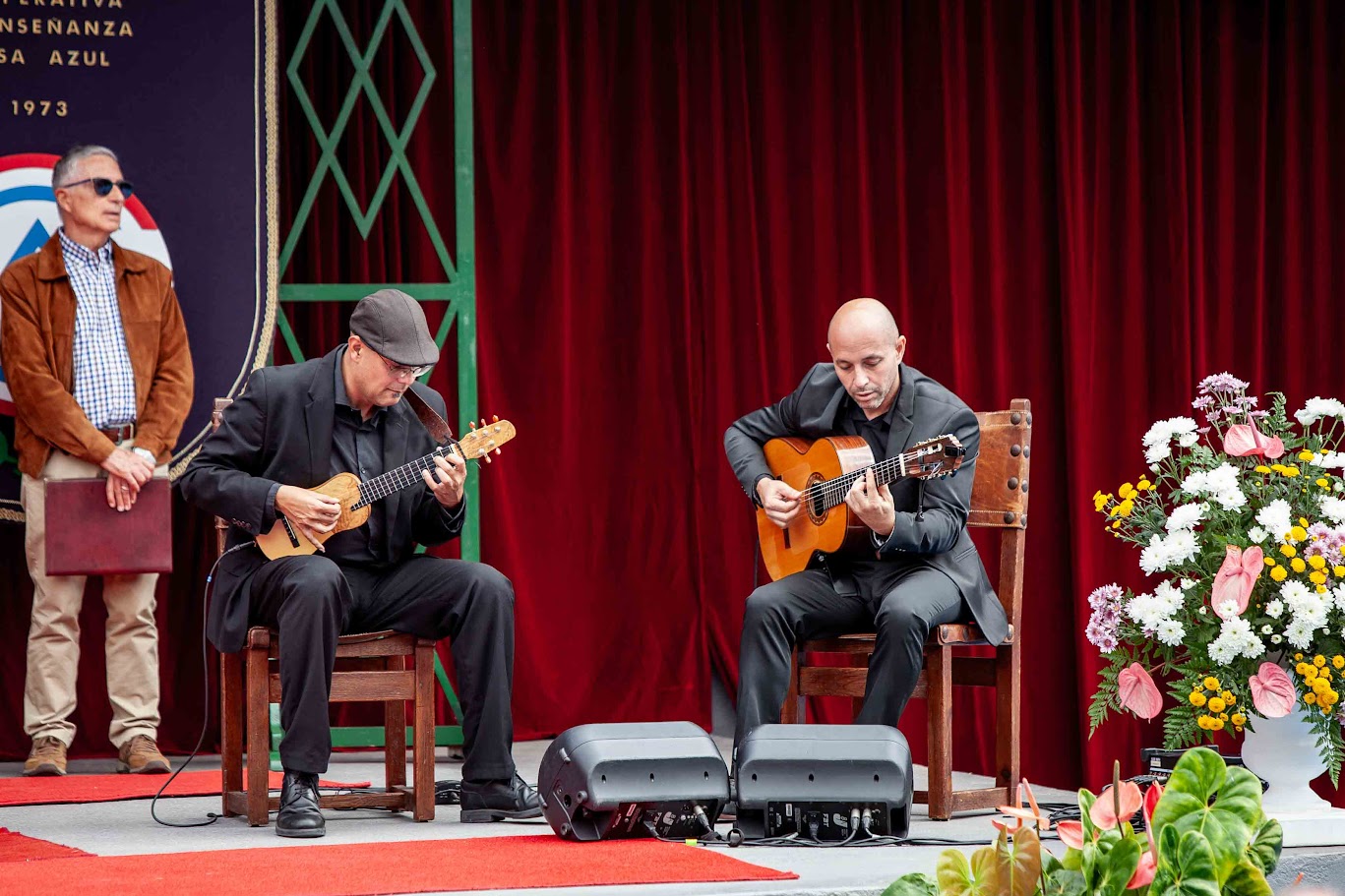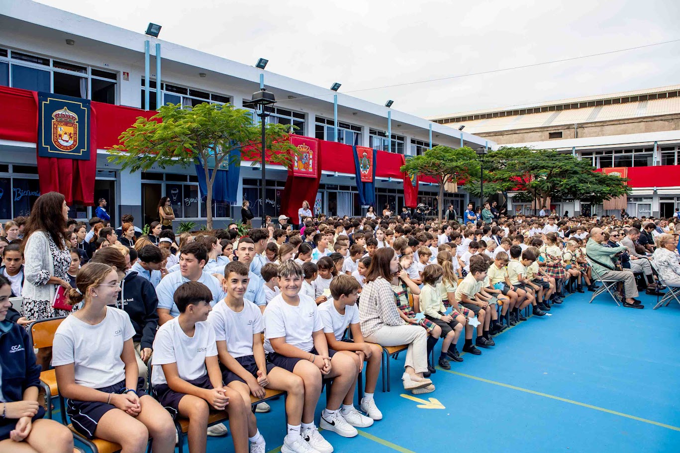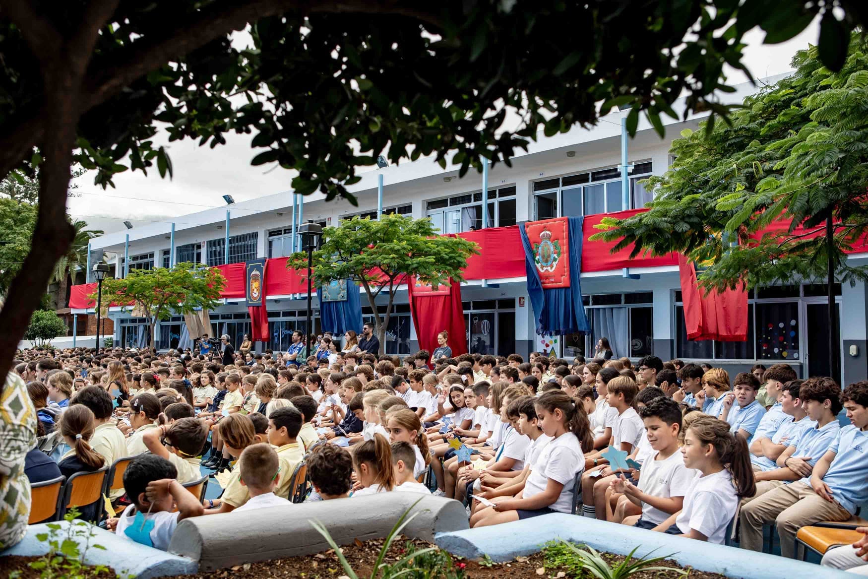 El acto, celebrado en el espacio central del colegio, fue presidido por el alcalde de la Villa Francisco Linares y el director del centro Federico Rodríguez, acompañados de otros miembros de la corporación municipal y representantes de los órganos sociales del colegio, de la asamblea general, del consejo rector, el equipo directivo, alumnos y alumnas, docentes, exalumnos y padres y madres. También asistió Leopoldo Afonso, alcalde de Puerto, y otros miembros de la corporación portuense, ya que el centro con cerca de 700 estudiantes que van desde infantil de 3 años hasta 2º de Bachiller, se encuentra en el límite con la ciudad turística y mantiene un fuerte vínculo con la misma. Durante el evento, los alumnos cantaron el himno del colegio, y también se contó con actuación musical de Juan Pablo Pérez con el timple, acompañado de Marco del Castillo con la guitarra.
