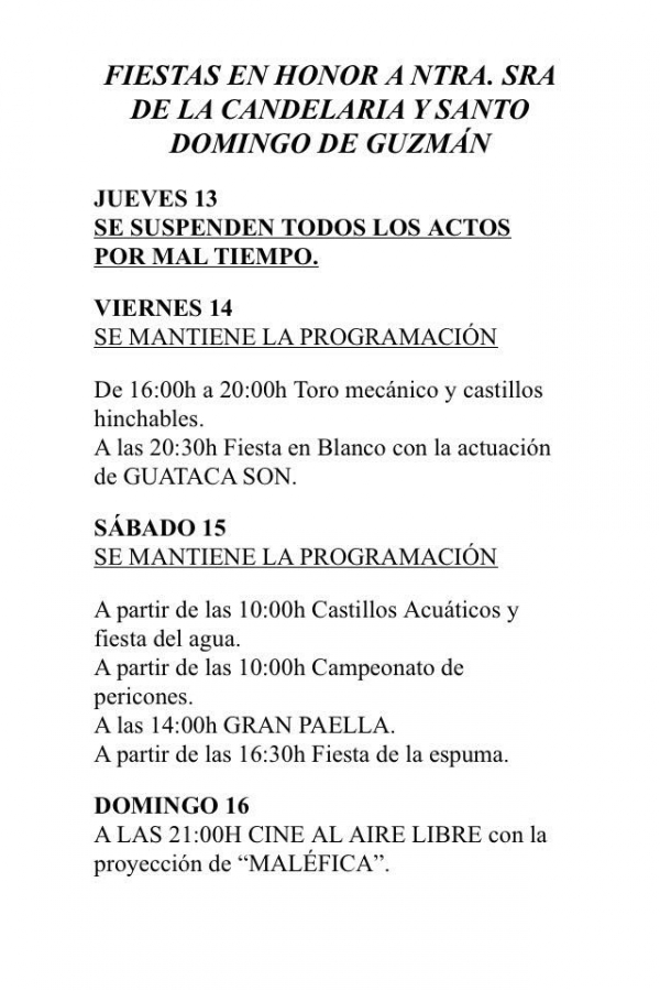 Debido al mal tiempo hoy jueves se han suspendido todos los actos festivos previstos dentro del programa de las Fiestas en honor a la Virgen de la Candelaria y Santo Domingo de Guzmán, pero se mantienen para mañana viernes y para el fin de semana.